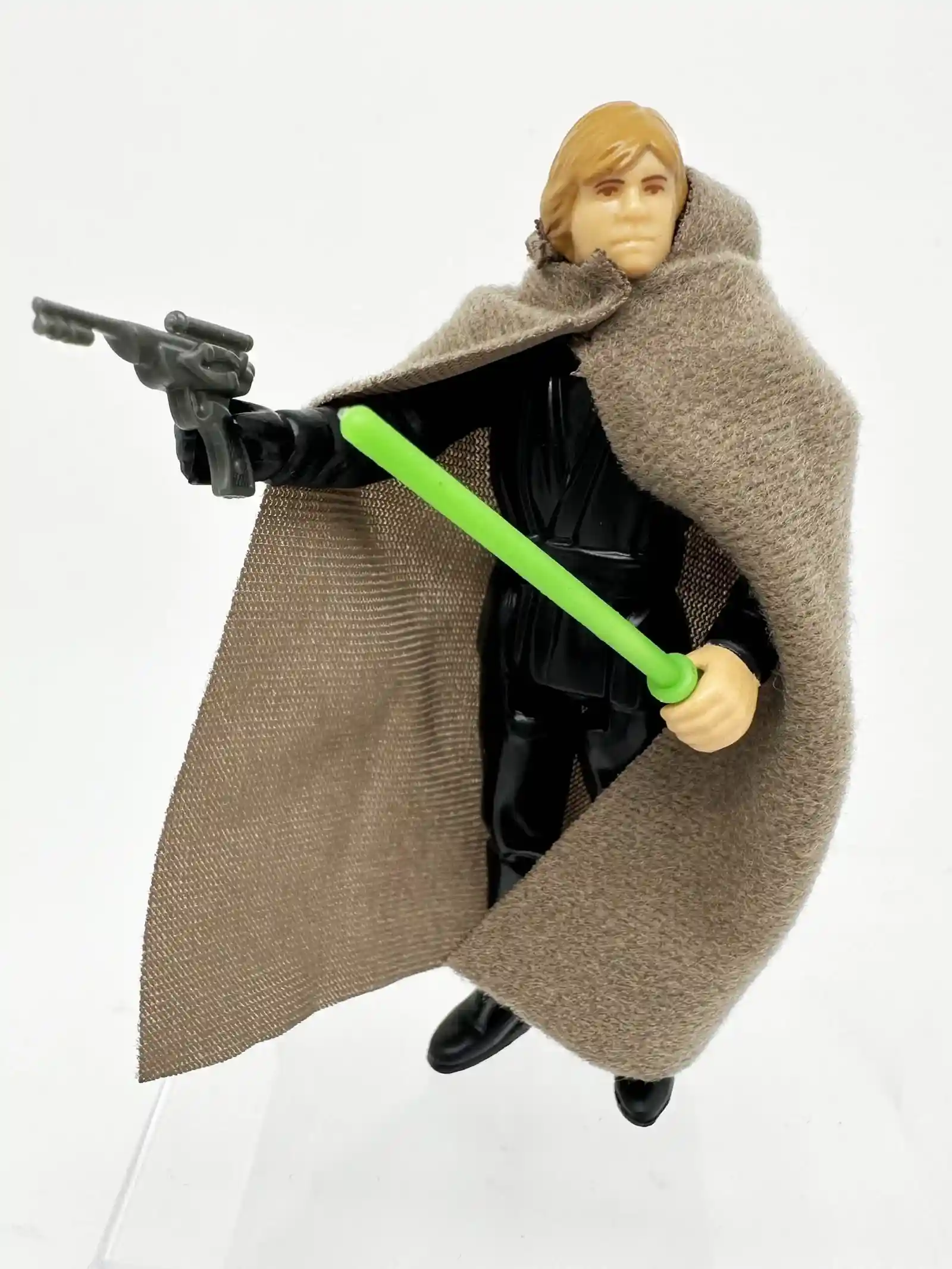 Jedi Knight Luke was one of the coolest figures that came out of the 1983 Kenner Return of the Jedi line! Luke comes with his brown soft goods Jedi cloak, a blaster and his special green lightsaber! If you had this figure as a kid, you were part of the cool kid’s club! In today’s aftermarket, a complete Jedi Luke can run close to $100 clams, but now you can have a fresh new one! The vintage version came in two unique variants, one with a painted face and plastic colored hair, and the other the rarer one of peach colored face and painted hair. The later was the preferred one as examples of the Luke with the painted face typically had nose rubs and such. Well, it looks like we will no longer have that problem here, as this new Jedi Knight Luke is the preferred painted hair version.