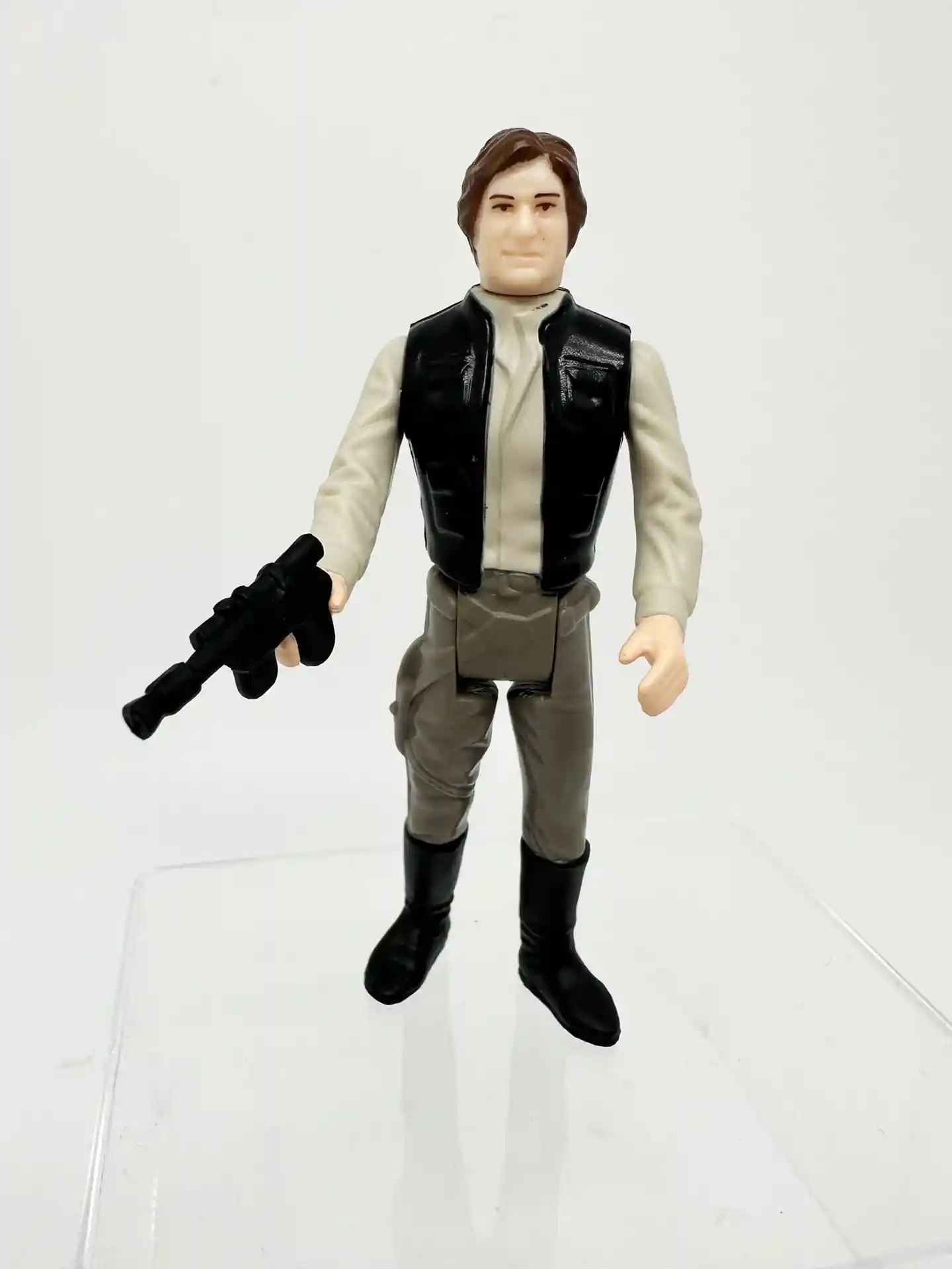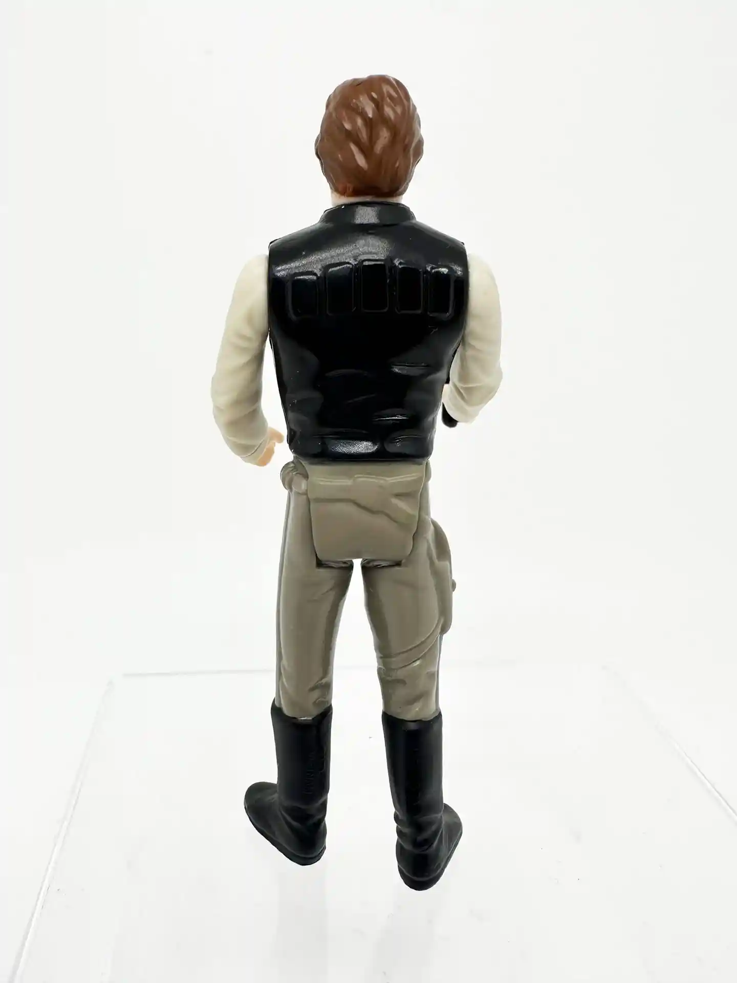 Here you can see what Han looks like without his trenchcoat. He has that broader shoulder design, with the black vest, and tan shirt.