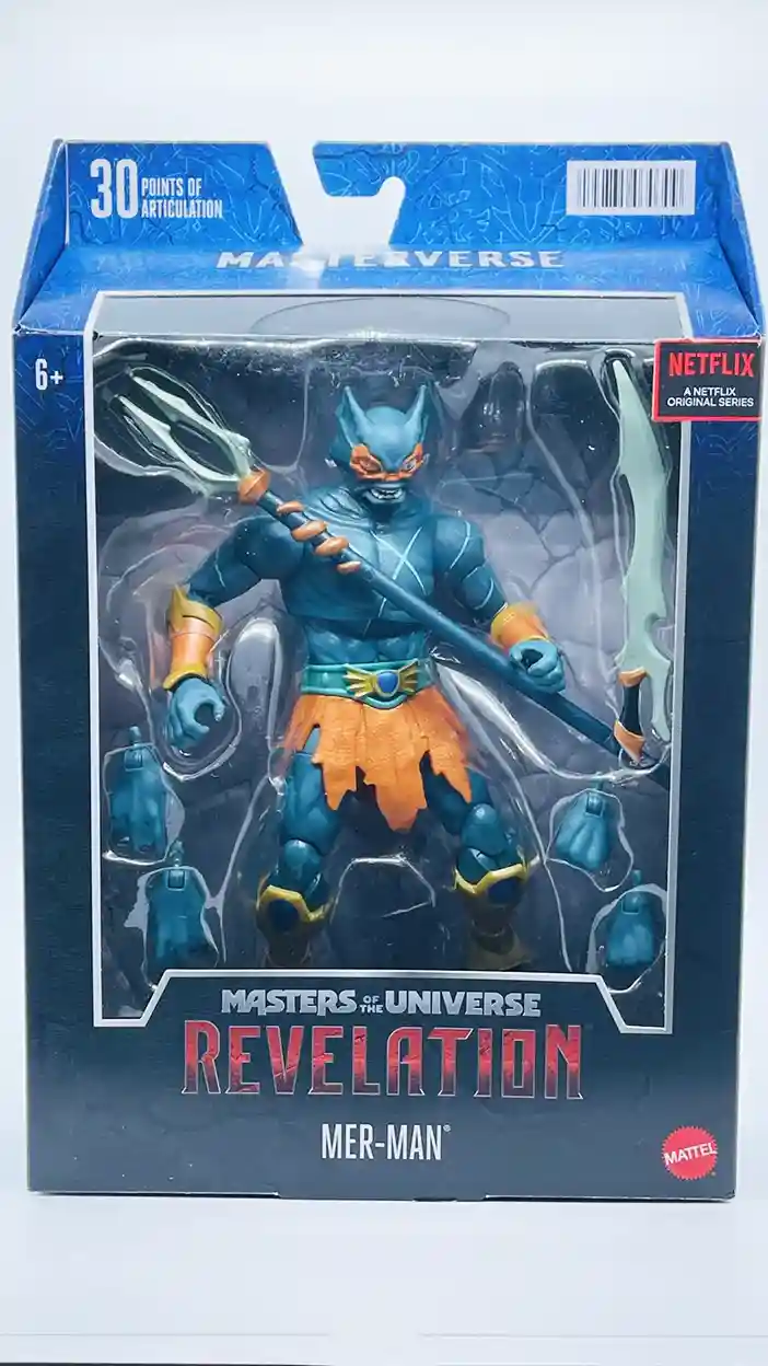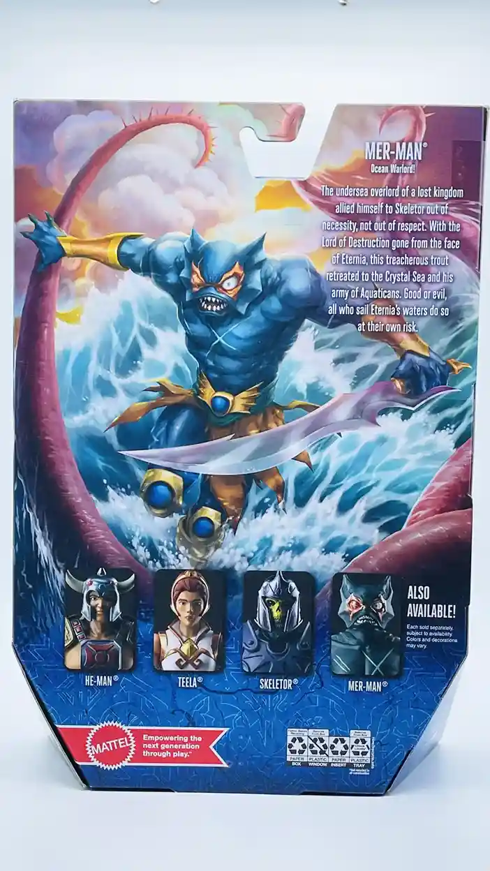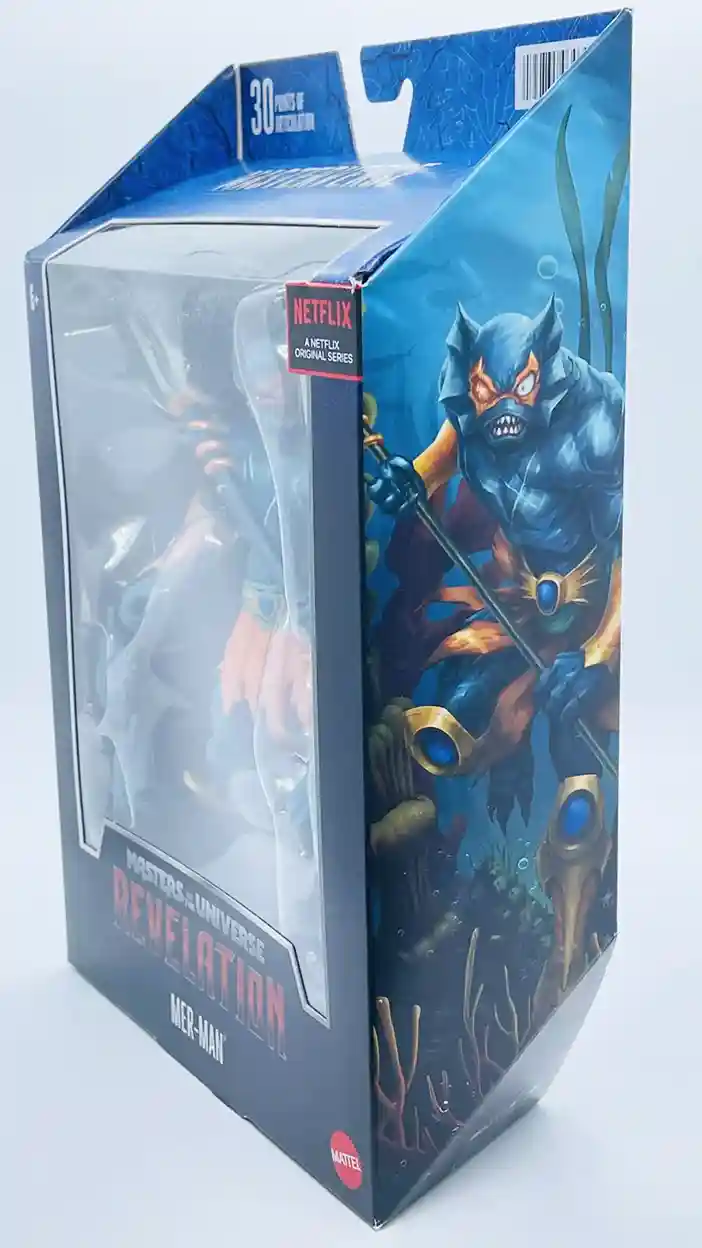 Packaged in the typical Masterverse collector friendly window box, but once you get to the side and rear of the box, you are met with amazing artwork! On the side of the package, Merman can be seen underwater, welding his bident staff with a fierce look on his face!