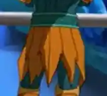 The arms are symmetrical, meaning they are both the same, but mirrors of each other. The figure is sporting orange with gold trim wrist bracers that contribute to that savage look. In this case, since he does not have any chest armor, something was needed to adorn his upper body.