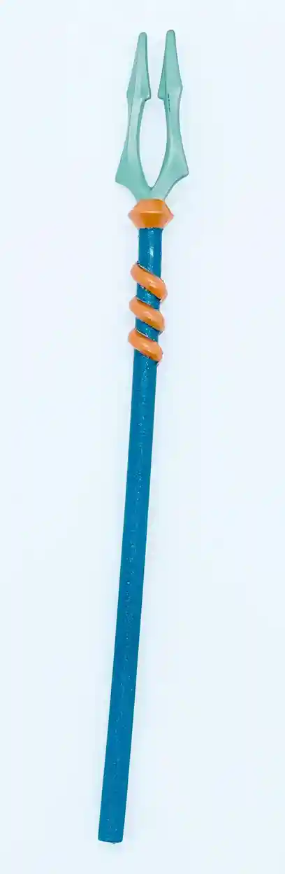 The Bident staff that comes packed with Mer-Man is very reminiscent of that of the Greek god Poseidon but with 2 pincers rather than the typical 3 of a trident. This is a departure of the typical 3 trident staff previous versions of Mer-Man have come with. The Bident staff has a more refined look than previous versions, less barbaric looking than that packaged with say the Mer-Man classics figure. The shaft is a metallic aquamarine color that really resembles the color of the ocean. The tips of the staff looks to be of a silvery green metallic color and has orange trim wrapped along the top portion of the staff.