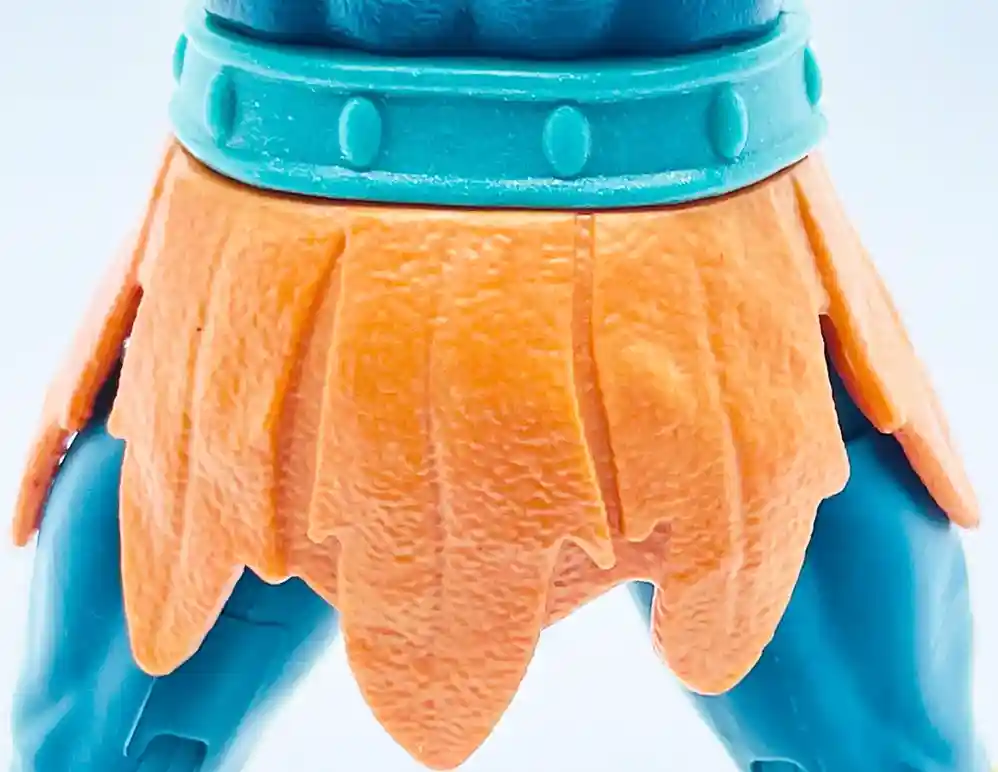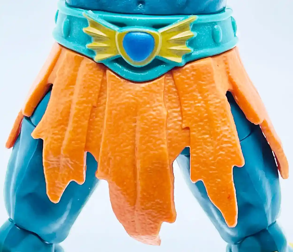 Merman is wearing a teal-colored belt and it has what looks to be a small version of the aquatic looking tie that the vintage figure used to have in a golden yellow color with a blue jewel in the middle. Mer-Man is wearing an orange colored loin cloth and looks to be more of a cloth or skinned version versus the fury kind we usually see on Masterverse figures. It looks longer and more tattered looking than the standards loin cloths and contributes to that more savage look of this version of Mer-Man.