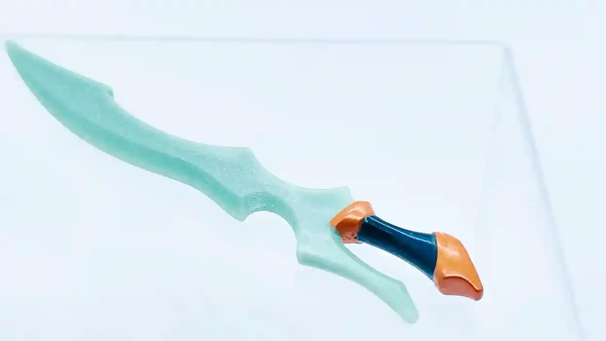 The sword has an all-new design, no longer the “corn cob sword” we are all used to Mer-Man coming packed with. It has more of a Arabian Scimitar look to it with it’s jagged blade that has a small curve to it. The hilt angled with a black grip with orange accents on the top and bottom of the hilt. The color of the sword is a lighter version of that silvery green that is on Mer-Man’s Bident and NO it DOES NOT glow in the dark!