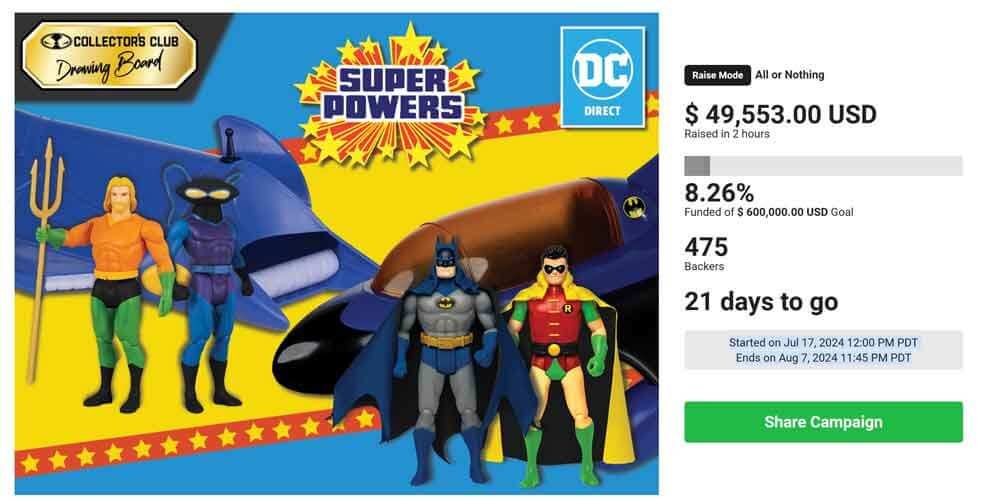 Collector’s Club Drawing Board crowdfund is live NOW. Featuring these incredible SUPER POWERS vehicles & figures. You can pledge your support for the project today and secure your tier level choice plus other perks for early supporters!
