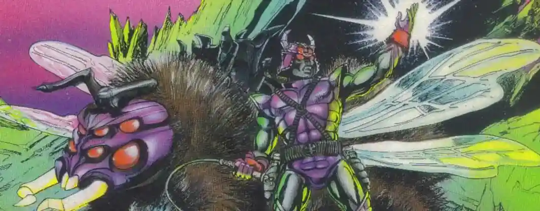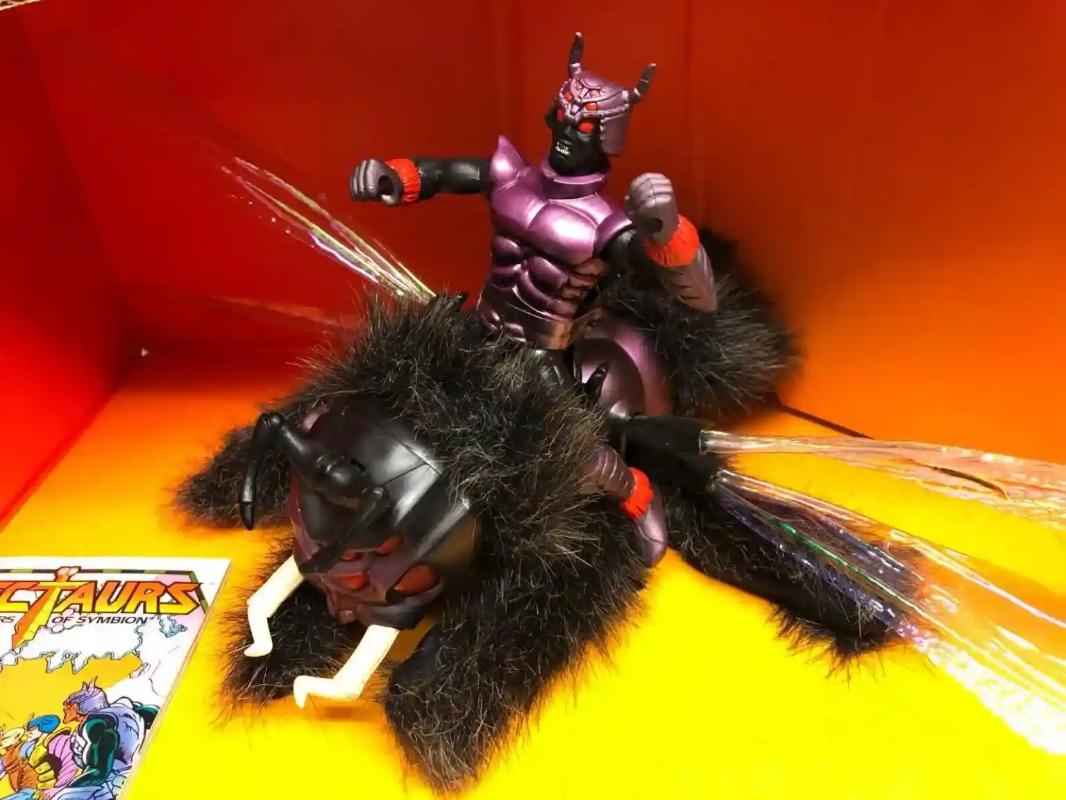 “Hideous leader of the Dark Domain’s armies, armed with a whip coated in lethal poison. Unlike most Sectaurs, he enslaved his animal companion, Spider-Flyer, rather than form a bond with it.[4] This was possibly because Spidrax had no forehead antennae (which all other Sectaurs possess) with which to initiate the tele-bonding process, but also to show his cruelty. Spidrax’s weapons included a venom whip, Slazor, Skall shield, net, and twin Venguns. Spider-Flyer was a Flying Steed with biting mandibles. Like Dargon, the second wave of toys was to have featured a Night Fighting Spidrax, which included a staff weapon, boomerang, and attachable armor which glowed in the dark. Night Fighting Spidrax would have been paired with an Action Bug named Stranglebug, which was a spider with unusually long bendable legs that could be wrapped around a figure. Unlike Night Fighting Dargon, however, Night Fighting Spidrax went unreleased with the rest of the second series.”