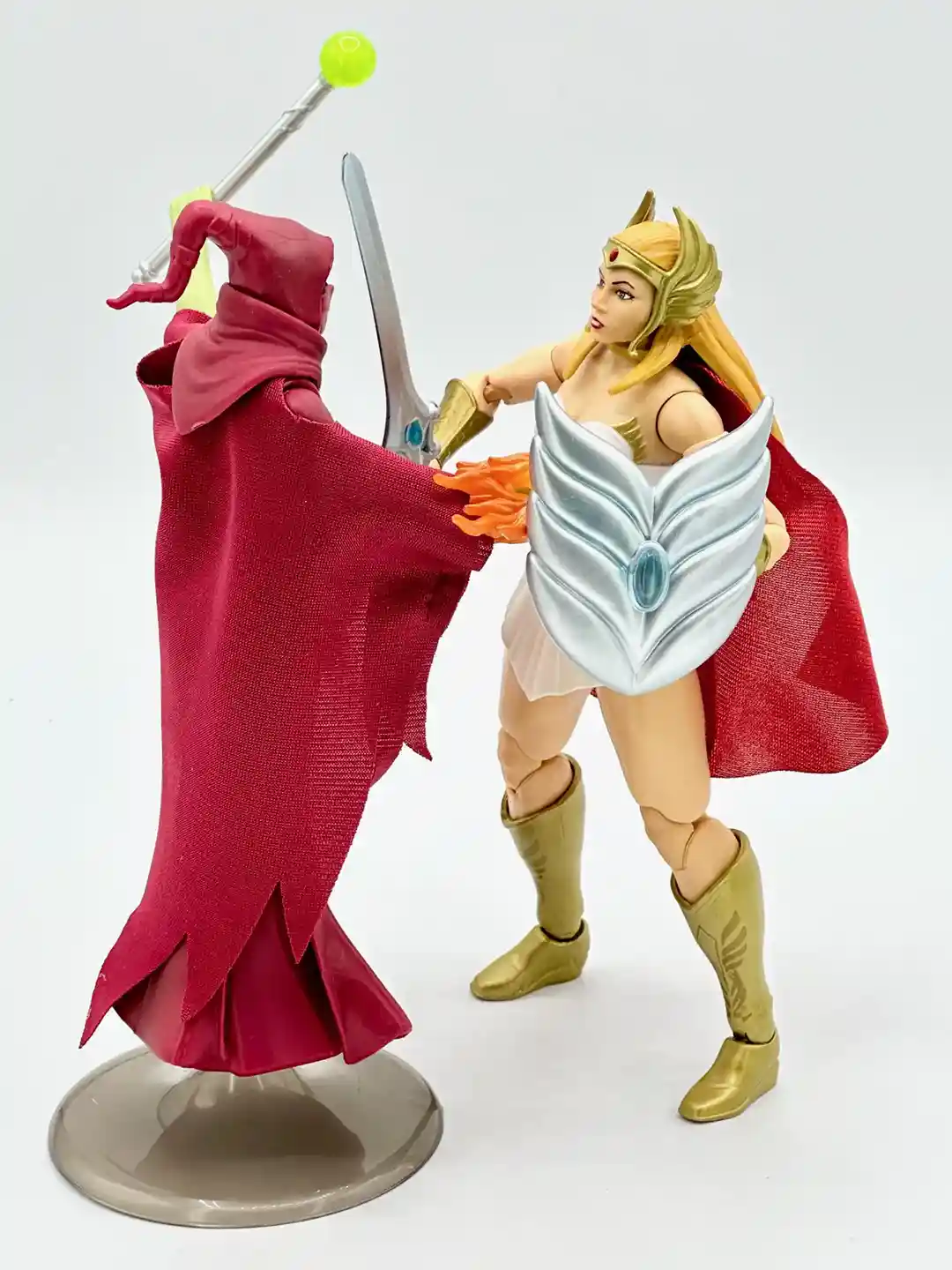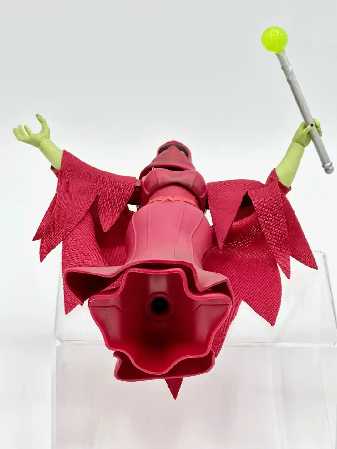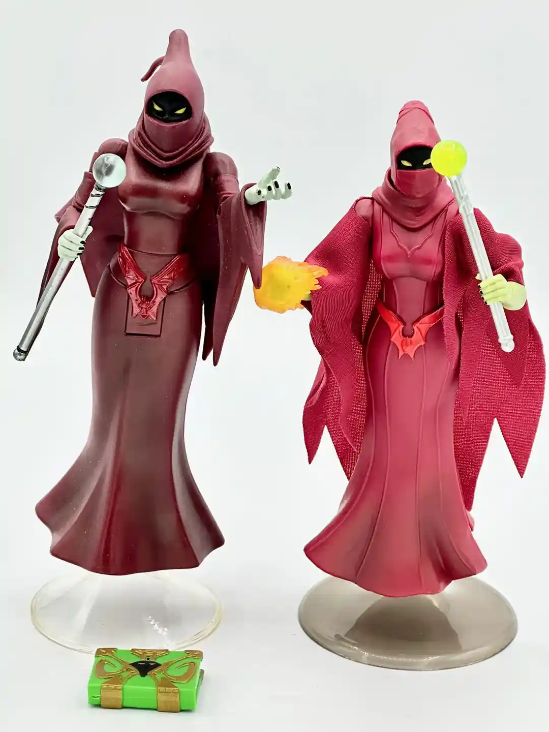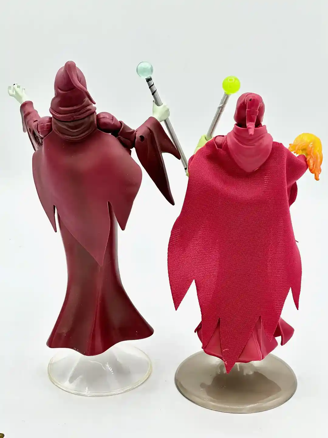 The MOTU Classics and Masterverse figures look very similar in sculpt with a few differences. The MOTU Classics version came with a hard plastic cape and the collar is built into her hood. Her Horde symbol is painted in more of a darker red and she has articulation at the waist and she can turn her upper body. As far as accessories go, the MOTU Classics version came with a similar staff and a magic spell book, which would have been great to see in the Masterverse line. They both have stands, which makes it appear they can levitate.