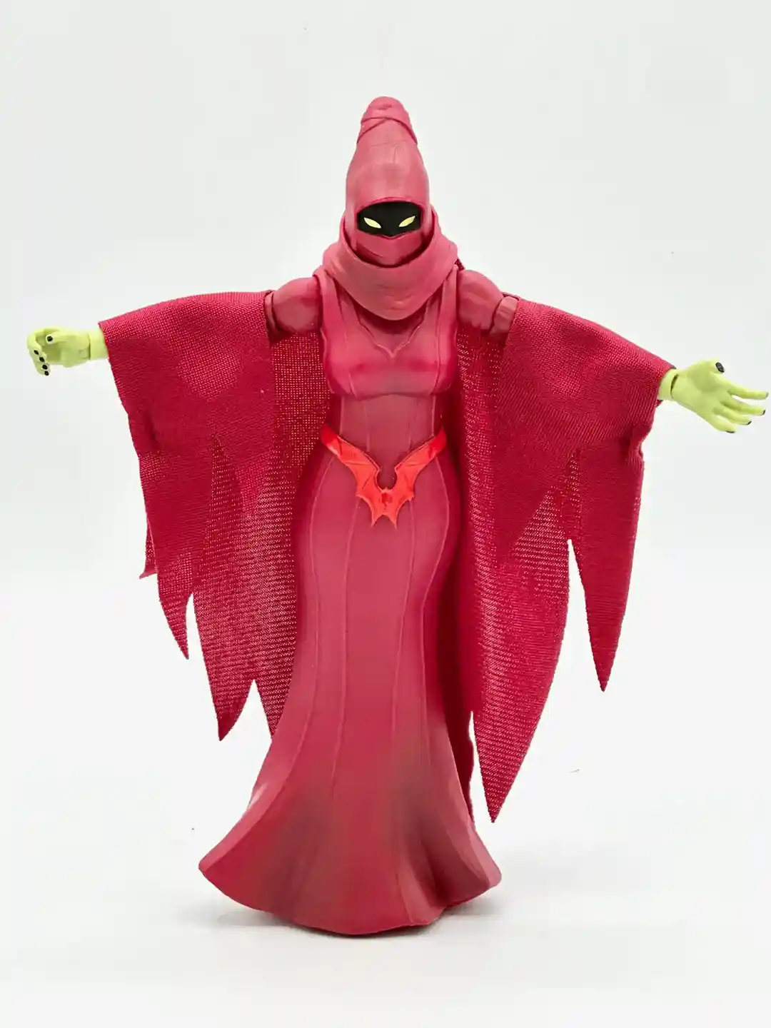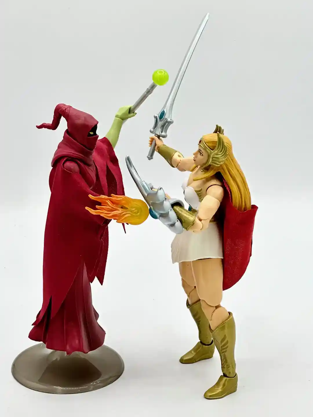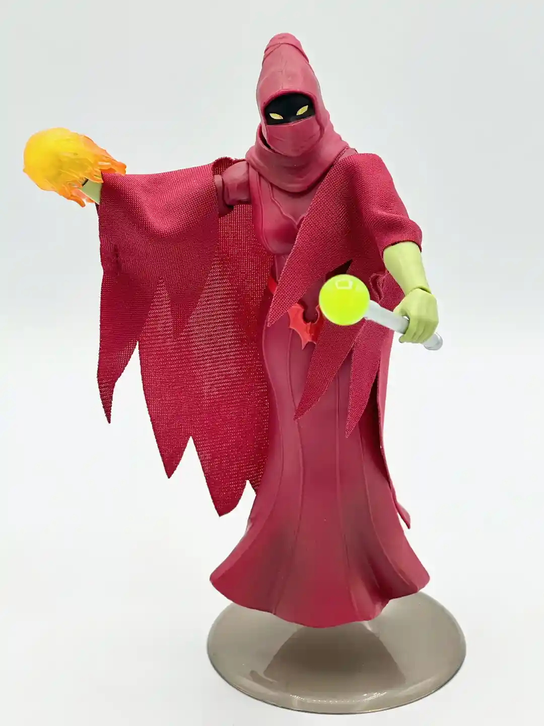 The MOTU Classics and Masterverse figures look very similar in sculpt with a few differences. The MOTU Classics version came with a hard plastic cape and the collar is built into her hood. Her Horde symbol is painted in more of a darker red and she has articulation at the waist and she can turn her upper body. As far as accessories go, the MOTU Classics version came with a similar staff and a magic spell book, which would have been great to see in the Masterverse line. They both have stands, which makes it appear they can levitate.