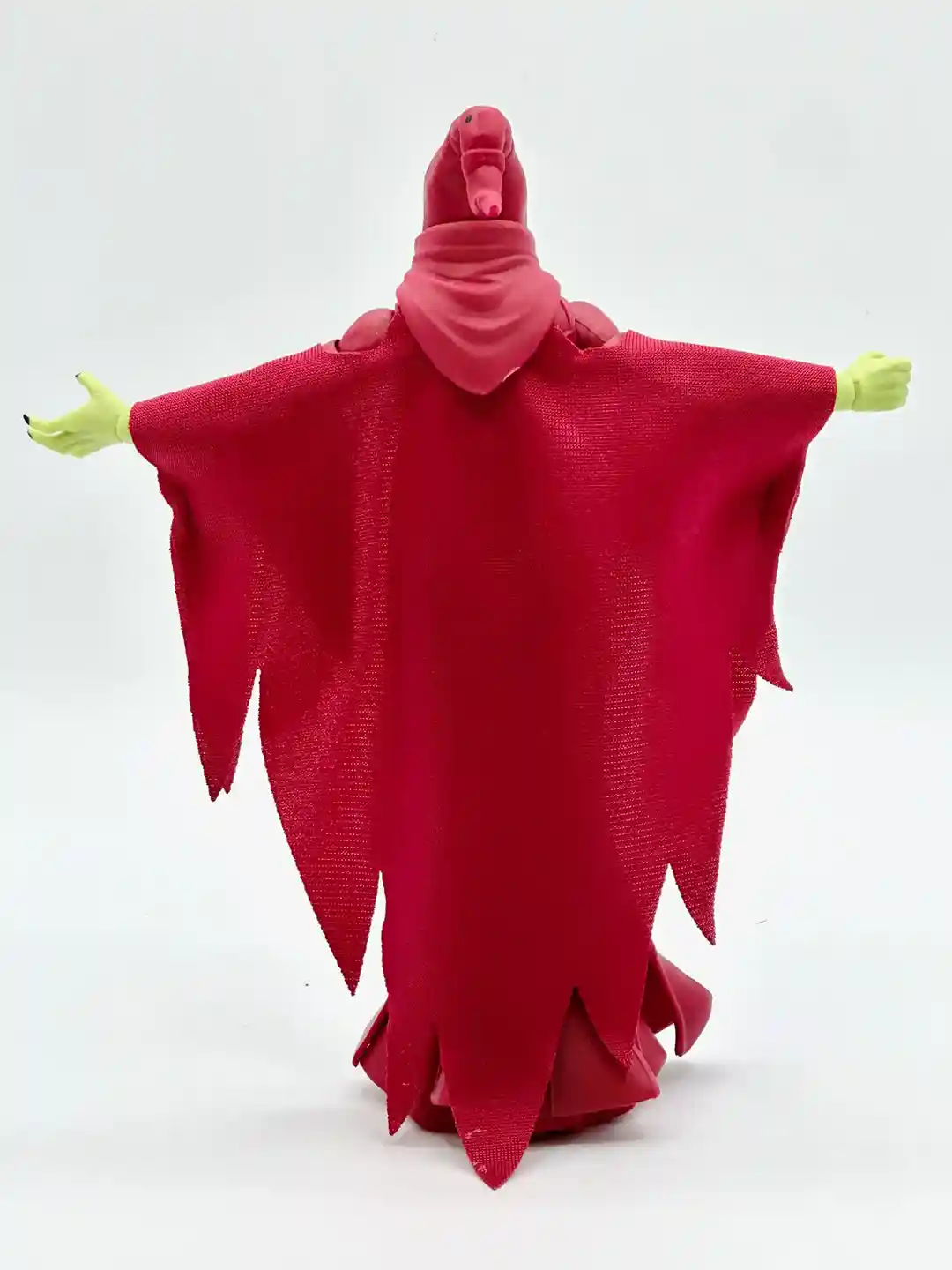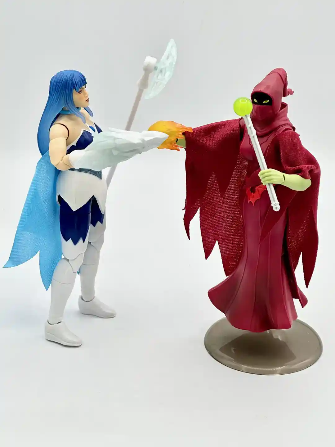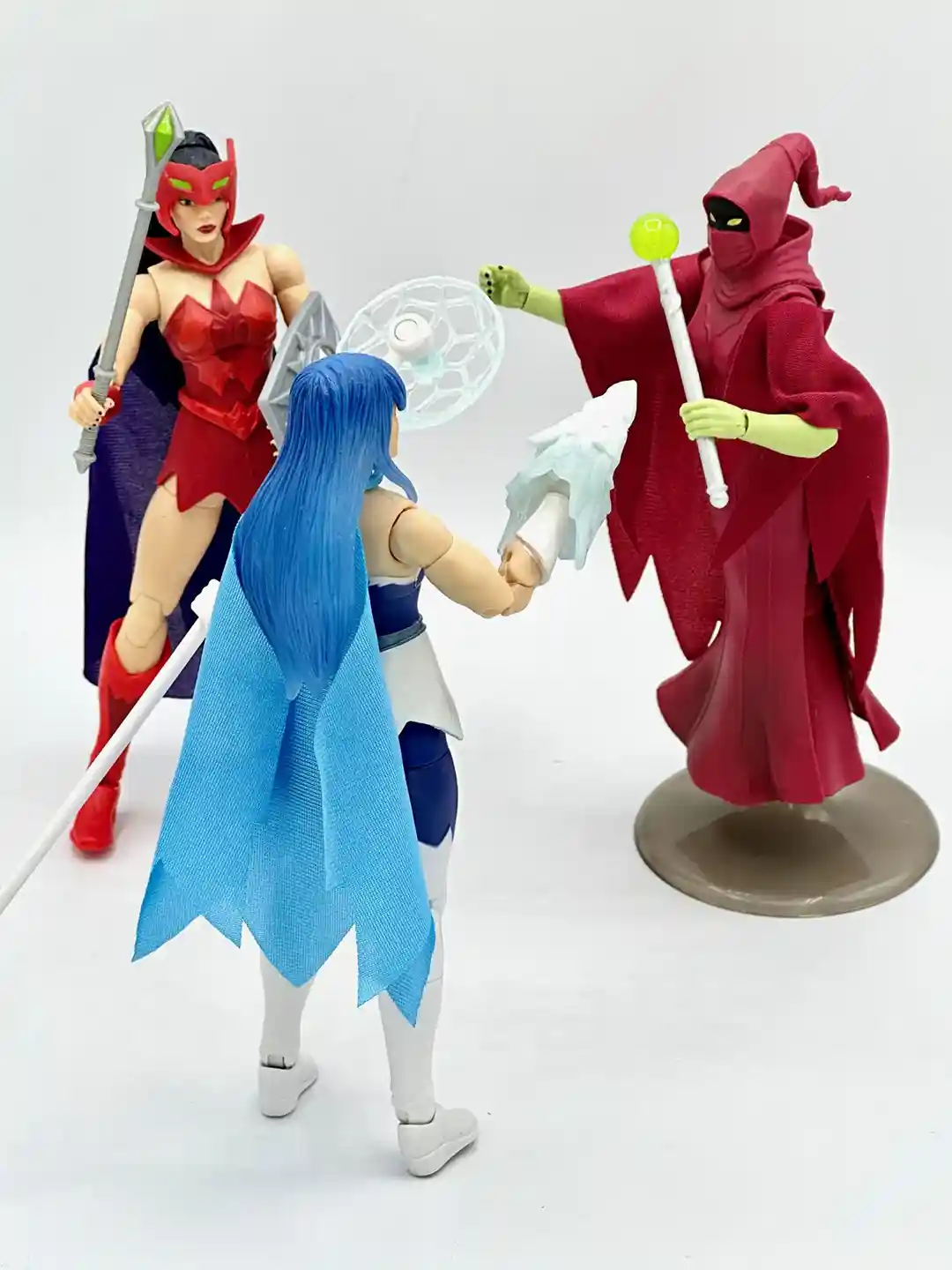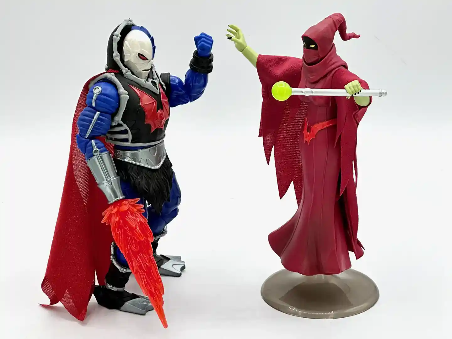 The MOTU Classics and Masterverse figures look very similar in sculpt with a few differences. The MOTU Classics version came with a hard plastic cape and the collar is built into her hood. Her Horde symbol is painted in more of a darker red and she has articulation at the waist and she can turn her upper body. As far as accessories go, the MOTU Classics version came with a similar staff and a magic spell book, which would have been great to see in the Masterverse line. They both have stands, which makes it appear they can levitate.