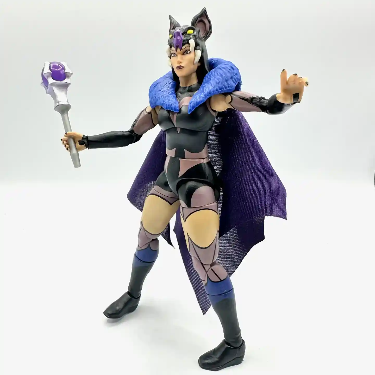 Straight from the Netflix Masters of the Universe Revelation cartoon, part 2, Evil Lyn takes over the Sorceress’ powers and becomes the new ‘Sorceress’. She comes with a soft goods cape that looks like a bat and a scepter.