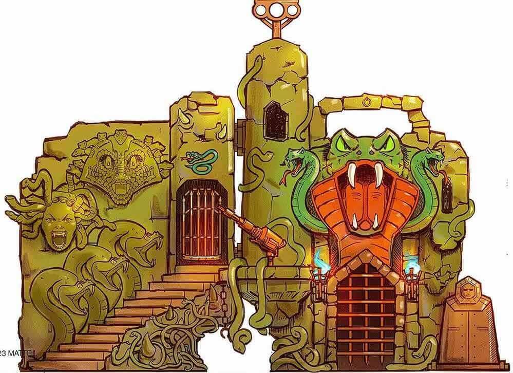 The playset has come under very high scrutiny as there are some very striking differences in what the fans voted on and what was produced. Axel’s illustration feels very organic as the snakes look like they are alive. The scuptures on the left side of the playset also bring in a more fearsome vibe. The Snake Lair that was revealed at SDCC 2024 has a more technologically advanced look and feel to it and it looks more like a castle with snake sculptures on it. With respect to size, in fan’s minds, they thought they were getting a playset close to the size of Castle Grayskull that was portable and could close up like a clamshell. The Snake Lair that was unveiled is more massive and more of a presence.
