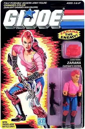 Zarana is a master of disguise just as much as her elder brother Zartan is. Whereas her brother uses holographics and depends on physical aspects of the art of disguise, she prefers to use makeup and method acting to deceive her targets. As a method actor, she deliberately assumes herself in the role of her disguise. She goes to the length of thinking, feeling and reacting as the object of her disguise does. In fact, she was so good at it that she could have been a successful stage actress. Her weaknesses, though, far outweigh her skills. As good as she can act, it doesn’t take long before her natural tendencies start to rise out. She is smart and ambitious but short-tempered, cruel and greedy. Zarana’s head had earrings (Right). Early in her release, the head sculpt was changed and the earrings were removed (Left). The earlier version with the earrings is much harder to find.”