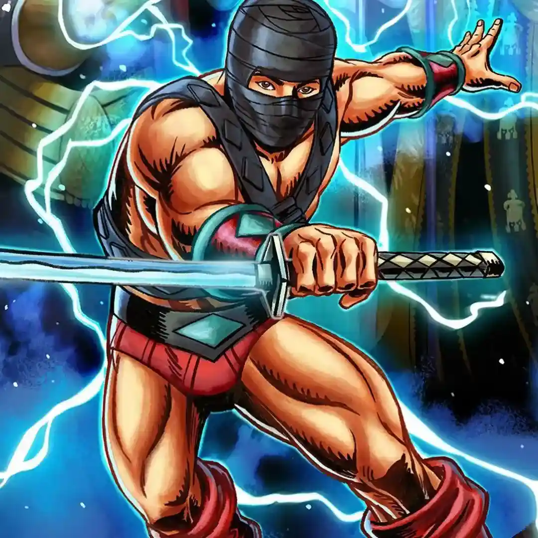 Space Sumo is a fairly simple looking character, wearing black chest armor, black belt with green diamond, red shorts, red and teal wrist bracers with the same green diamonds as the belt, and red boots with green toes. He carries a silver ninja sword which is pretty cool looking.