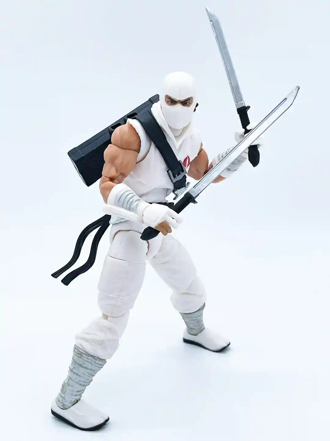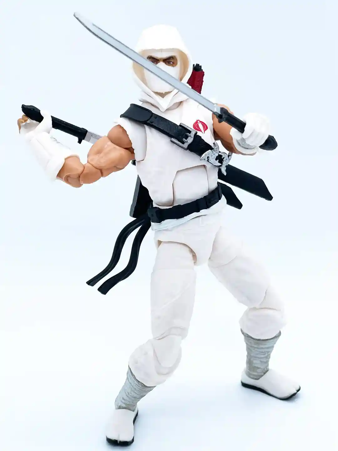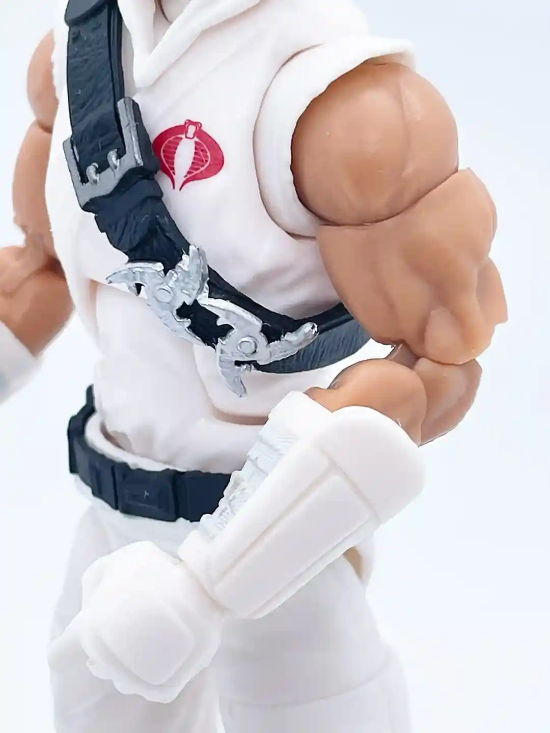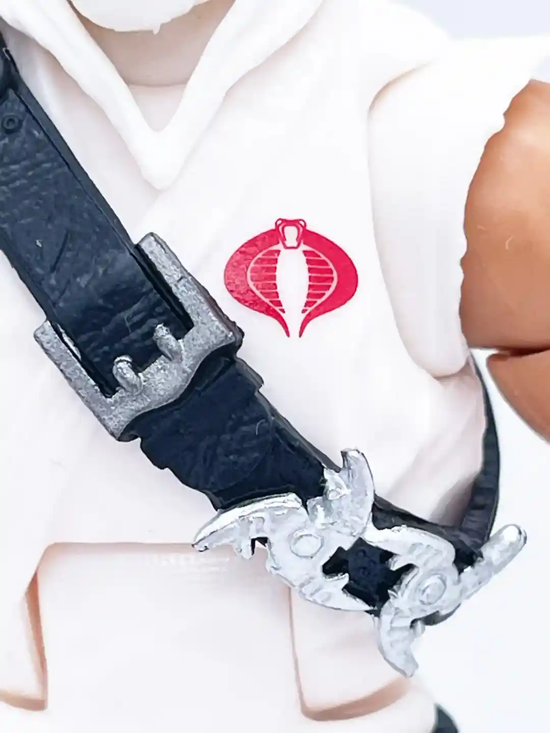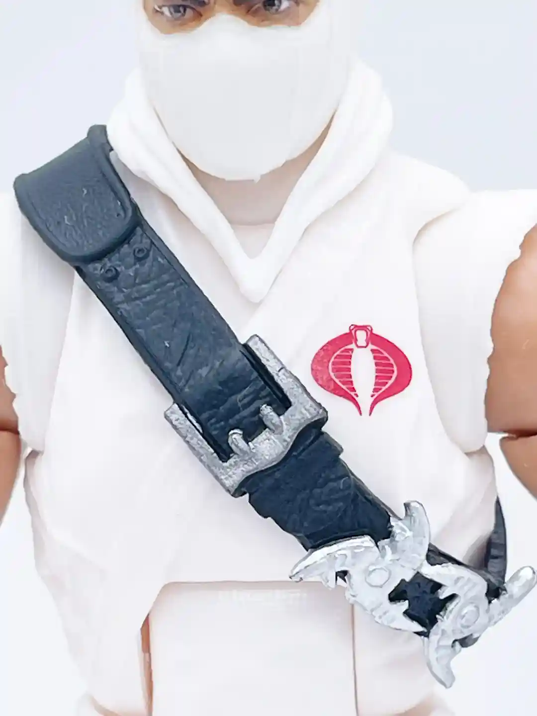 The classic red cobra symbol stands out against his bright white gee and you can see his classic black strap across his chest that has a some very nice leather detailing to it! Setting off the strap are two throwing stars and a silver buckle.