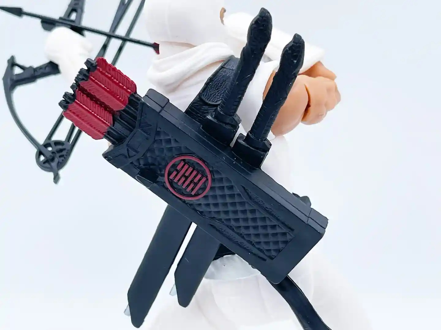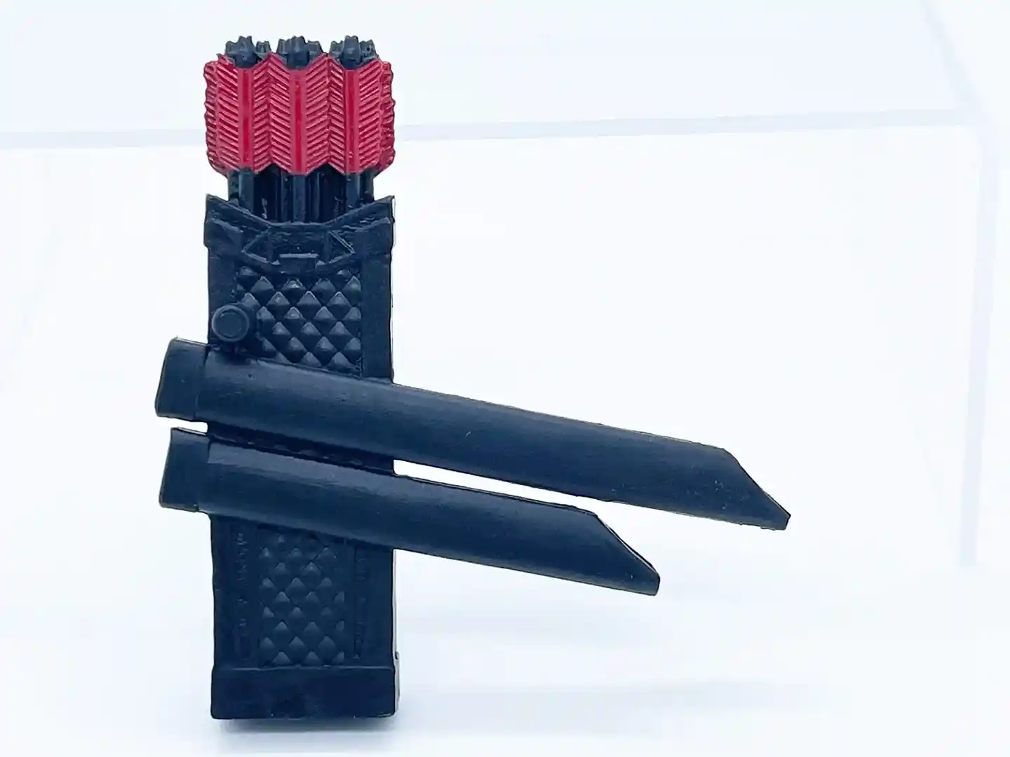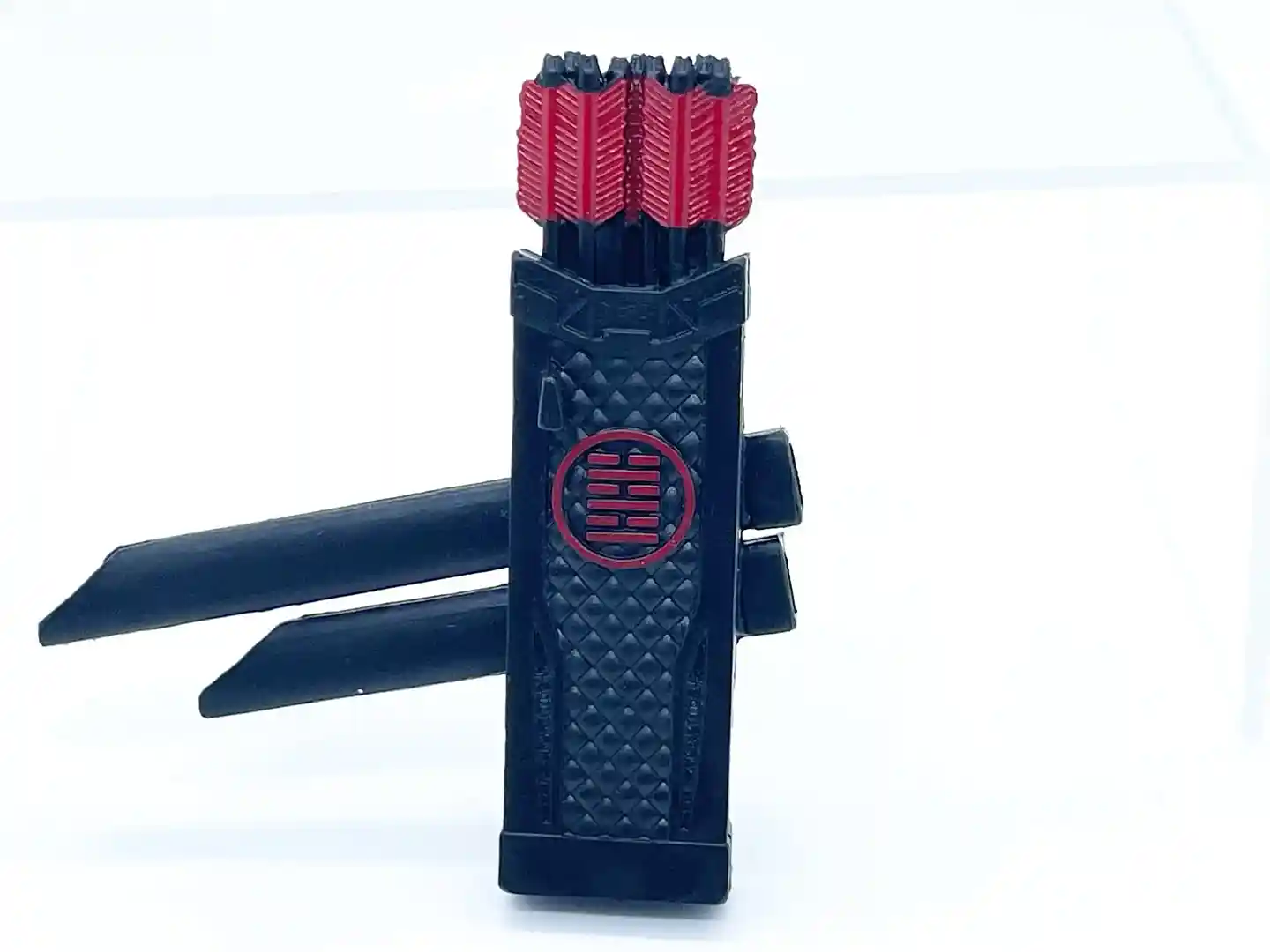 The quiver can stow his long and short swords and feature an array of sculpted arrows that are not removable. They have red accents on the fletching that ties in the Arashikage symbol on the back.