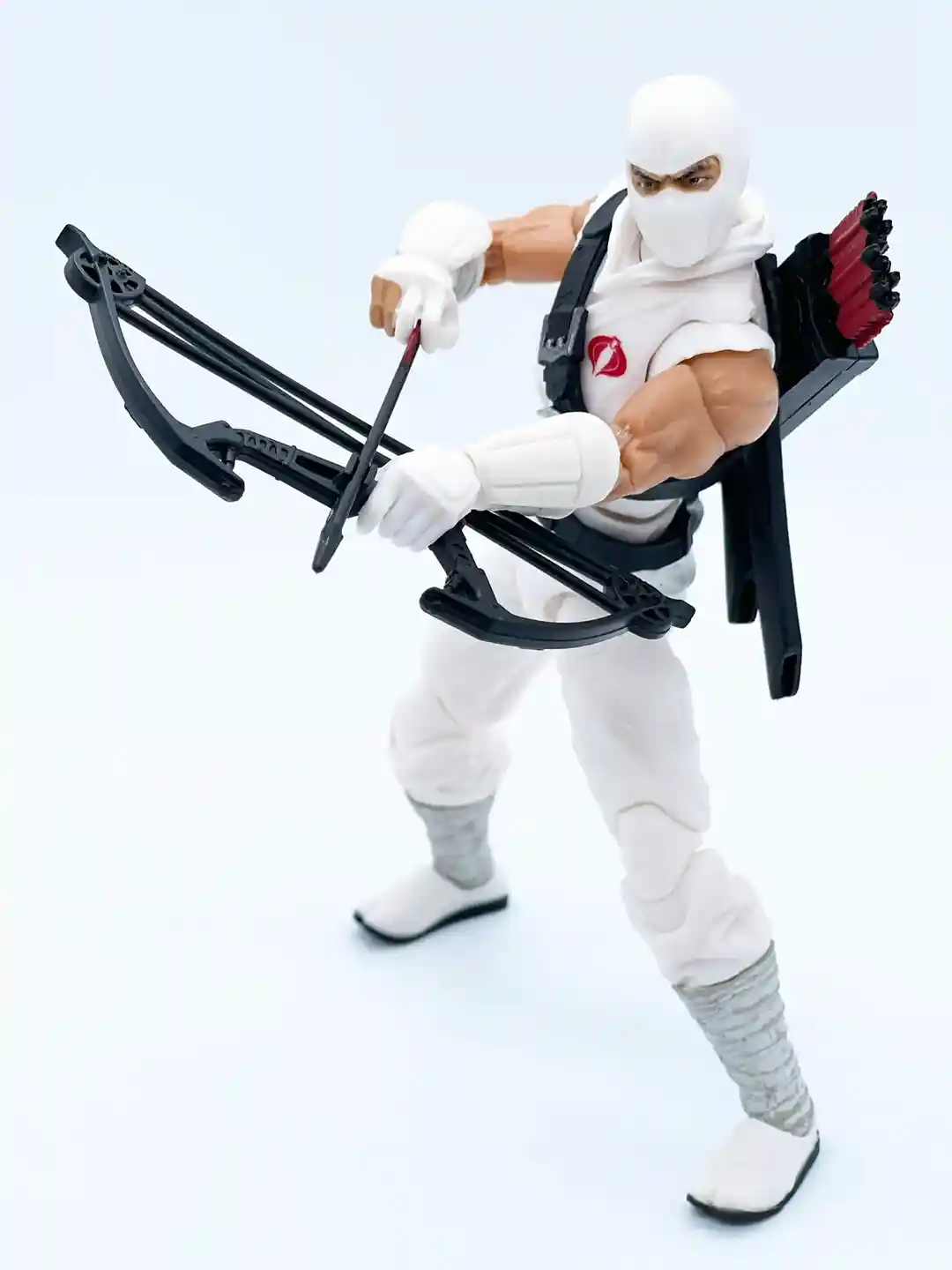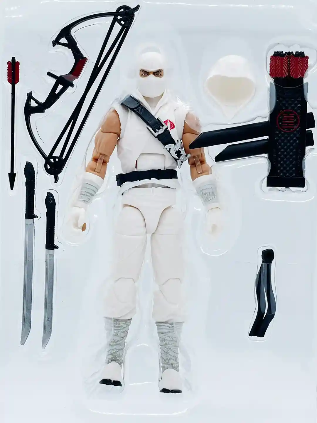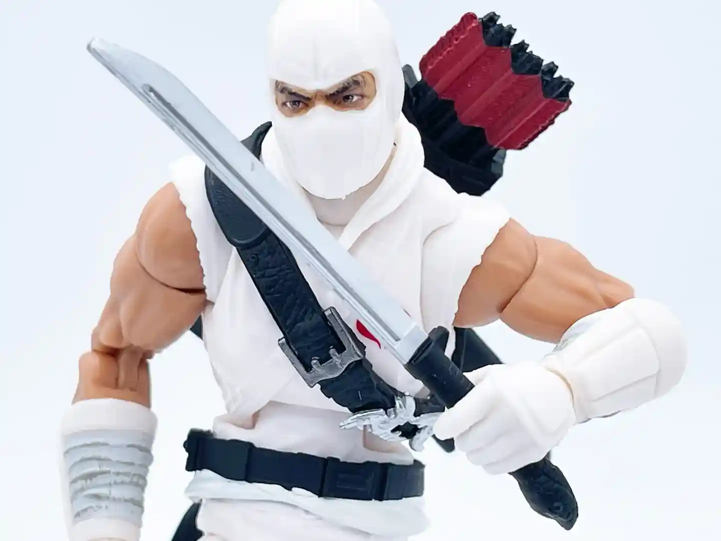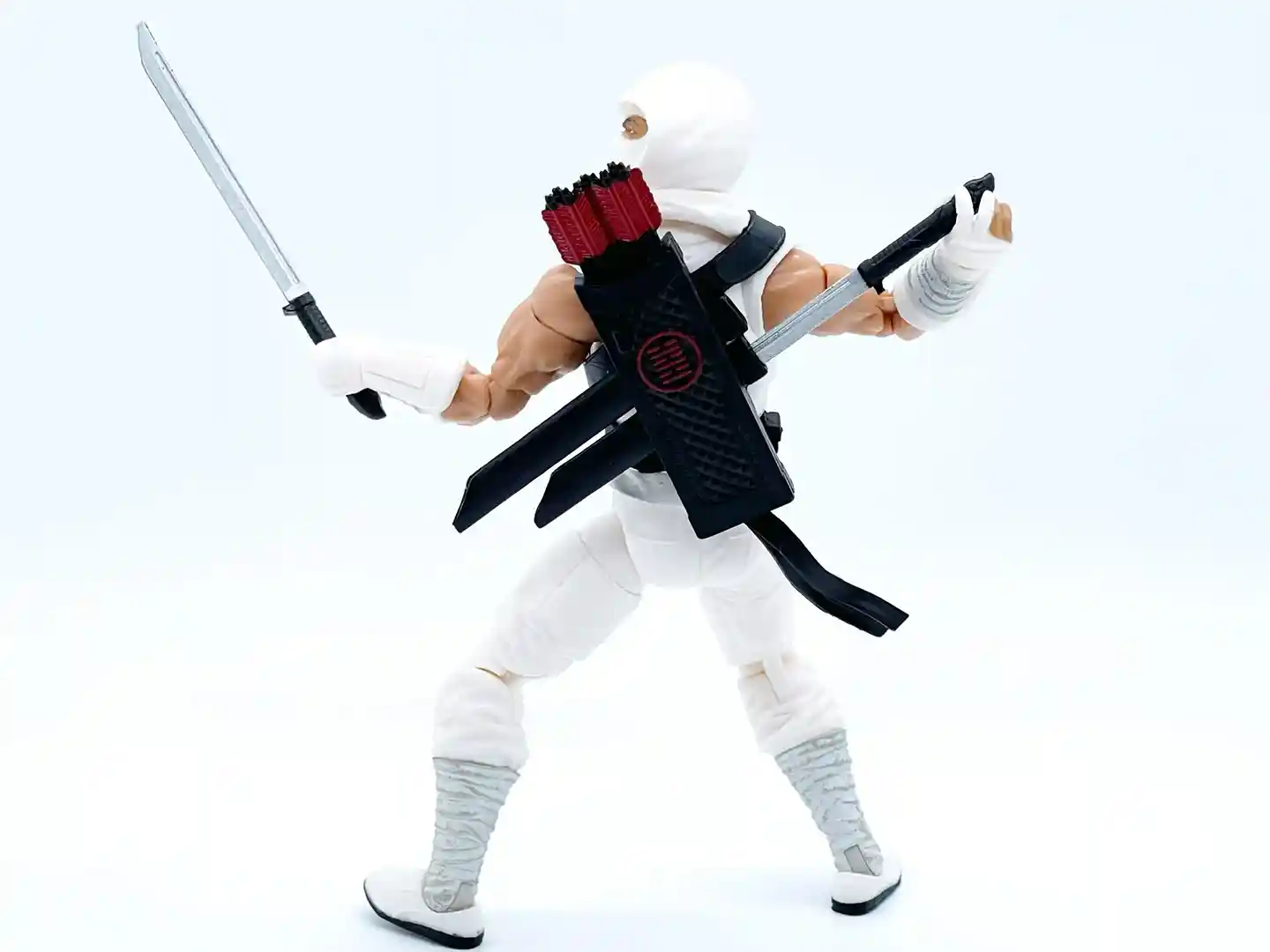 The quiver can stow his long and short swords and feature an array of sculpted arrows that are not removable. They have red accents on the fletching that ties in the Arashikage symbol on the back.