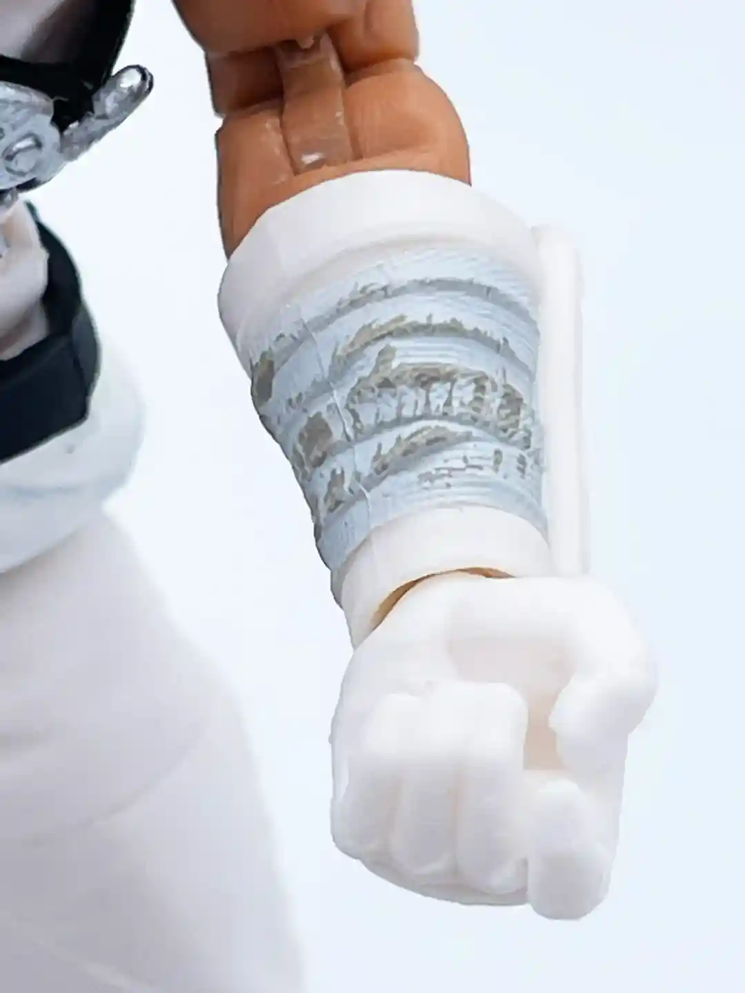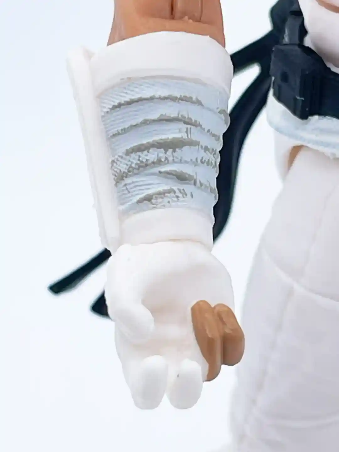 His left arm features the same gauntlet but his hand sculpt is painted all white to simulate a glove.