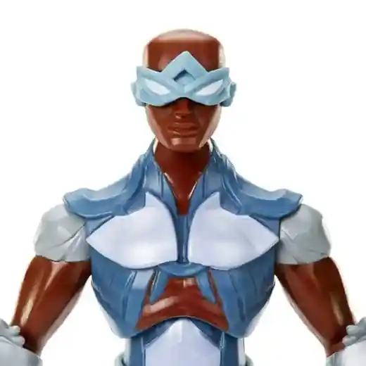 Stratos is on the core figure blister card where you can see an illustration of him in the upper left corner and the only parts you can see are his head and a little of his upper body. Like all of the other core figures, he has a demo of his Power Attack feature on the bottom left of the blister. This version of Stratos can best be described as angular and you can see that represented in his goggle design. In a power blue color scheme, the goggles are sculpted on to his head and they attach over his ears, which is a departure from the original Filmation Stratos design of the 80s where he wore a helmet and much of his face was hidden. The armor detail is a mix of blues, whites, and blue/gray tones that differentiate the armor from the rest of his outfit.