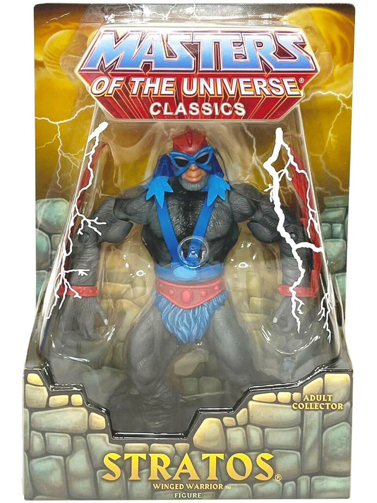 His bio read’ “Lord of Avion, a civilization of winged simians who live high on the peaks of the Mystic Mountains. Stratos is a brave honorable warrior allied with King Randor. Although all Avions have the ability to fly using the magical Emerald Staff, many, including Stratos, have augmented their armor with rocket packs and jets to increase their speed and distance. As a member of the Masters of the Universe, Stratos fights bravely against the evil forces of Skeletor.”