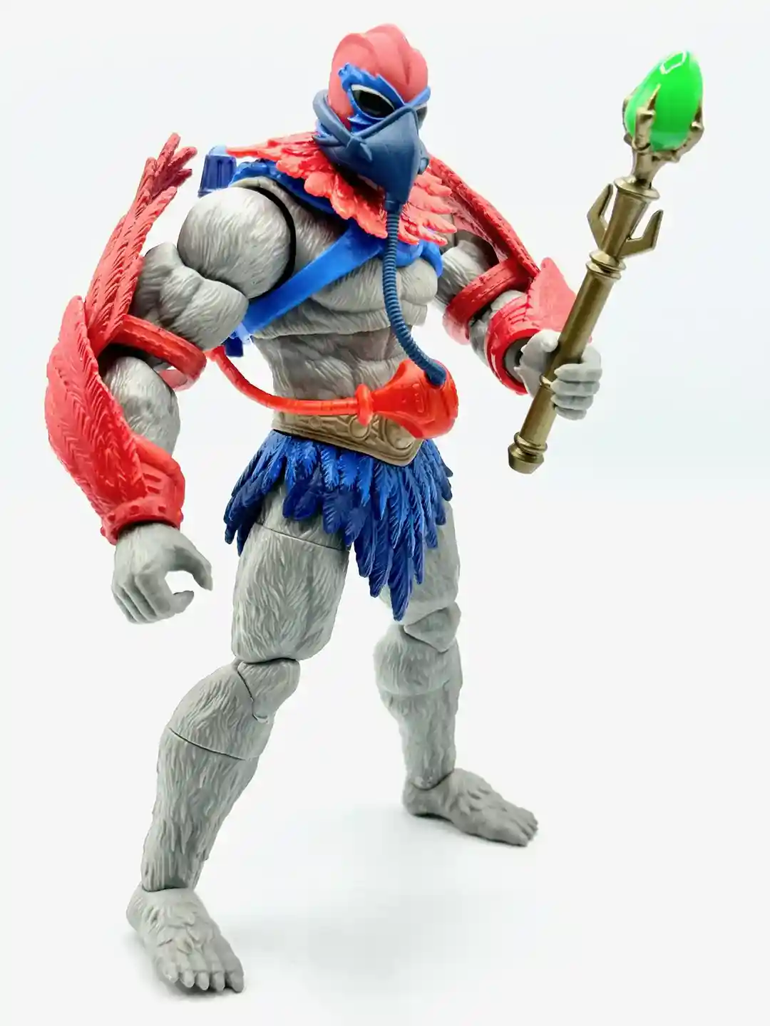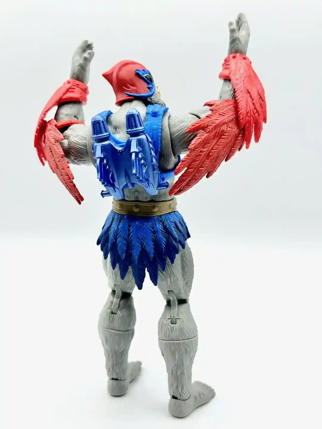 Leaked back in March by our friends at Canal Dos Rosmineiros, Stratos has landed and we have our hot little hands on one! Adding another figure to the growing New Eternia Masterverse sub-line, this version of Stratos has a very different look than previous versions of the heroic winged warrior as he has a face mask that plug into his belt! Some familiar pieces making their way back to the line are his Emerald Scepter of Avion and his classic red wings that go on his arms. His wing have a special suprise so let’s dive into the details of this fantastic update to an old friend!