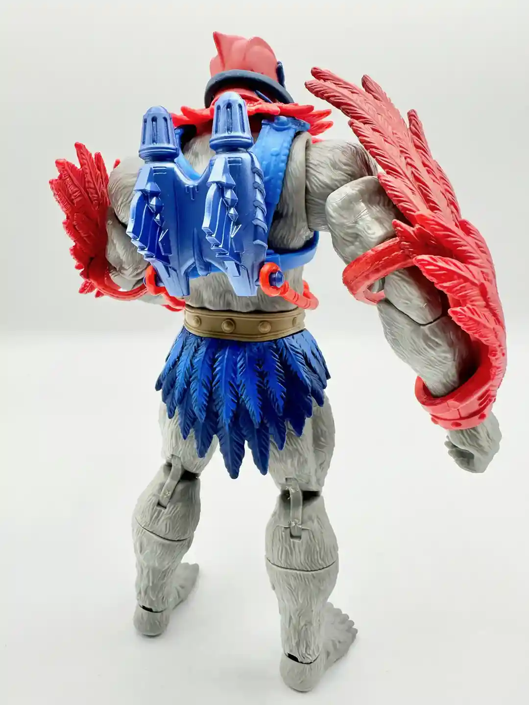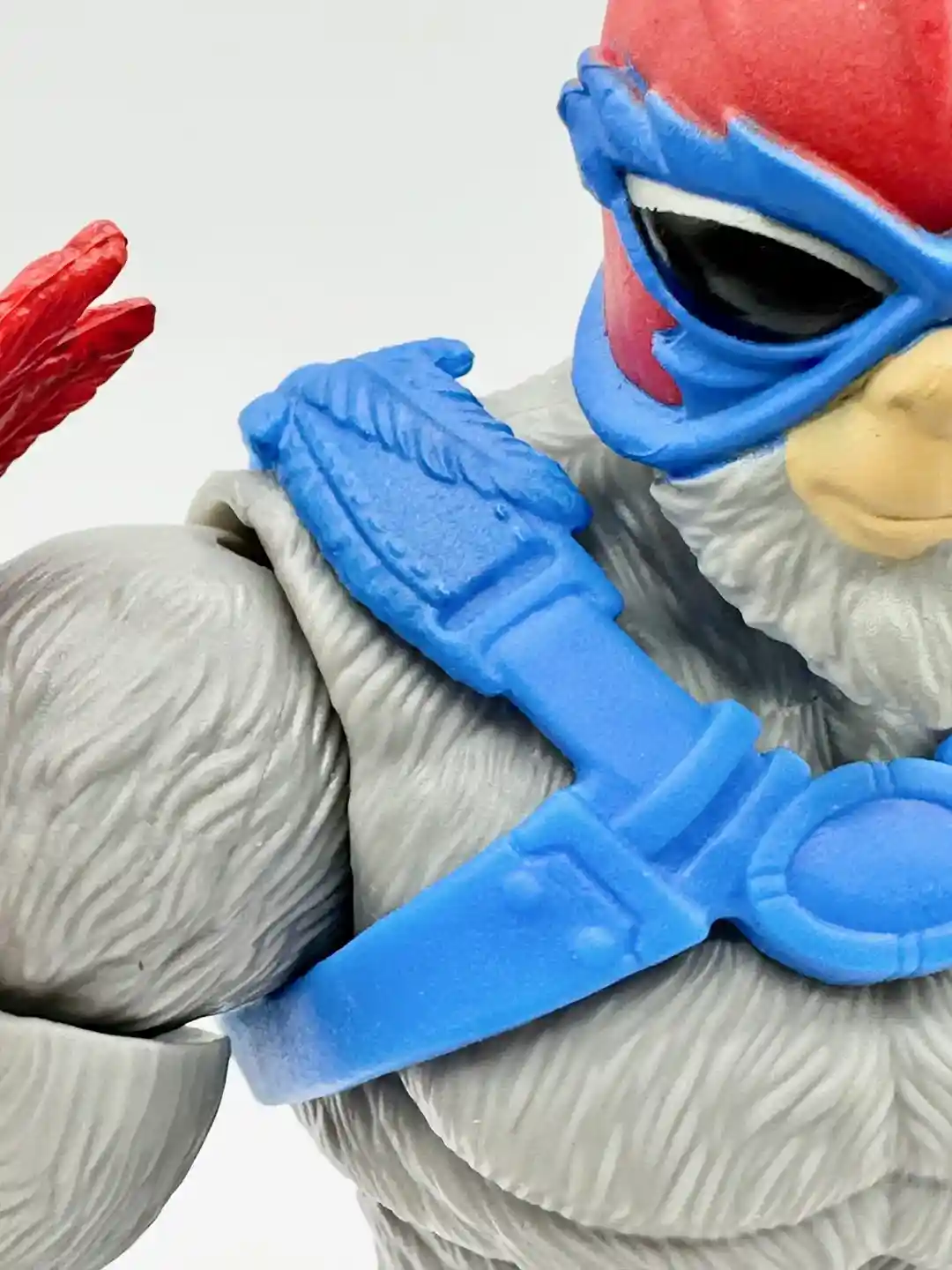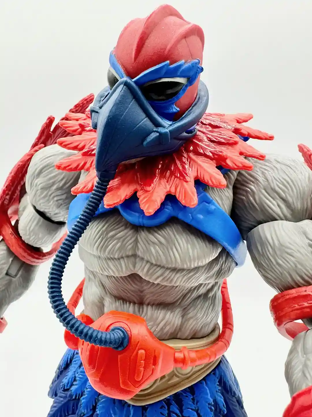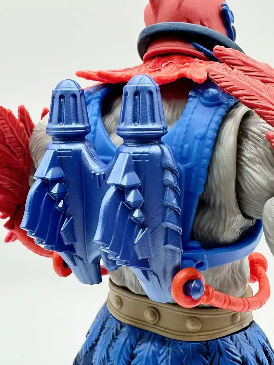Stratos has a familiar, yet updated head sculpt with his helmet retaining the three crests. One update to the helmet design was the middle crest coming to a point at the back of his skull. The blue outlining his eyes has some flair and it swoops all the way around the side of the helmet. His eyes are given a glossy paint app and pick up the light just right to have a cool reflective look to them. Stratos also has an angular beard design, giving his face some depth and dimension. Because this is a New Eternia figure, you can also see the feathers around his neck, which are removable.