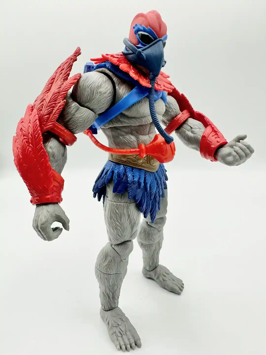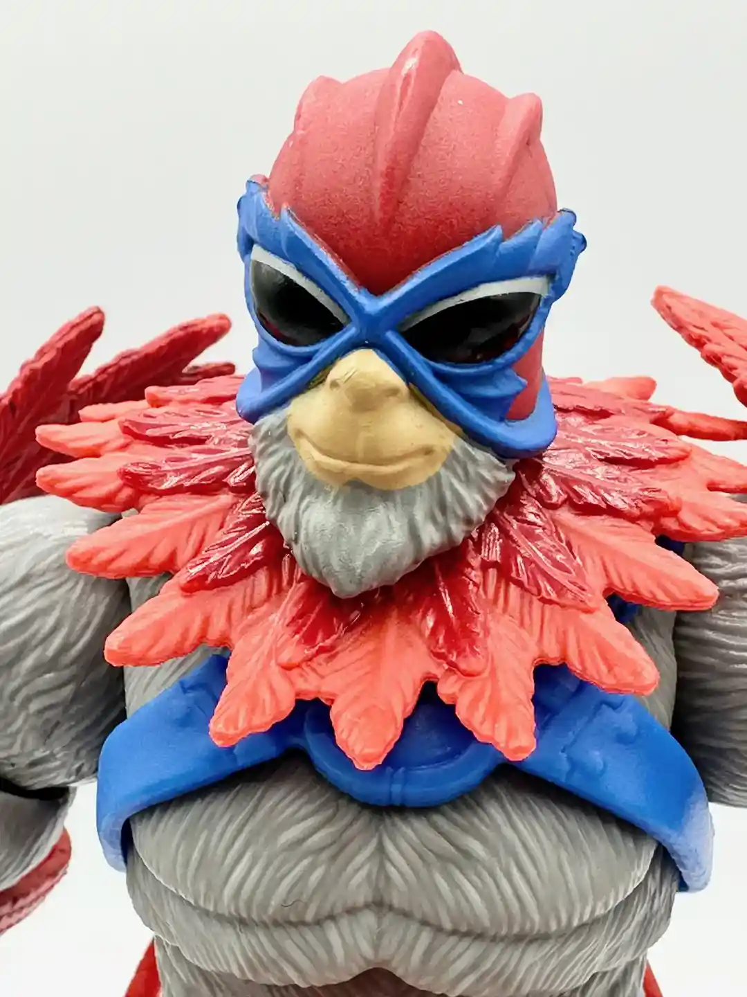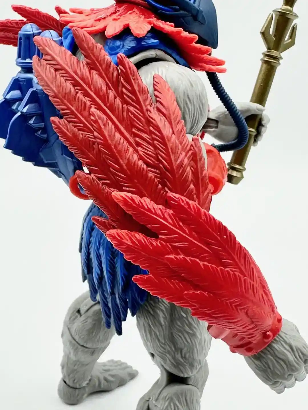 Stratos has a familiar, yet updated head sculpt with his helmet retaining the three crests. One update to the helmet design was the middle crest coming to a point at the back of his skull. The blue outlining his eyes has some flair and it swoops all the way around the side of the helmet. His eyes are given a glossy paint app and pick up the light just right to have a cool reflective look to them. Stratos also has an angular beard design, giving his face some depth and dimension. Because this is a New Eternia figure, you can also see the feathers around his neck, which are removable.