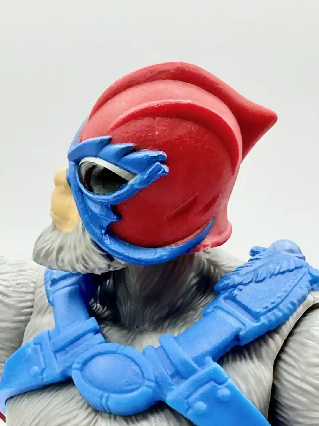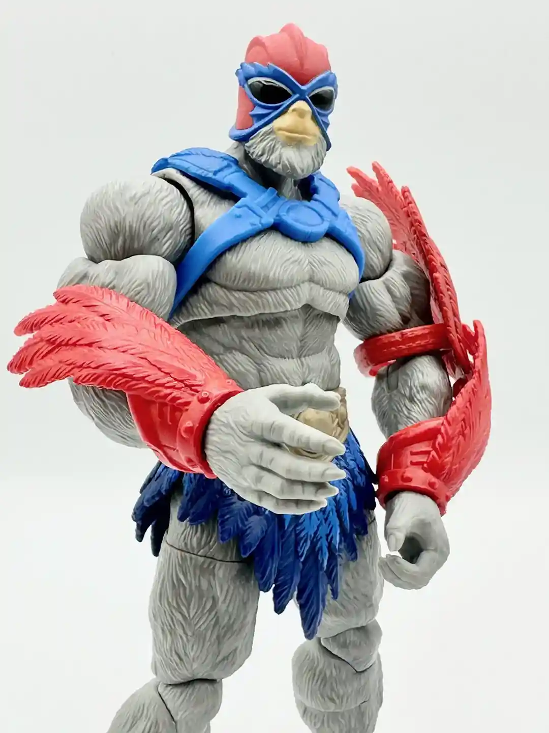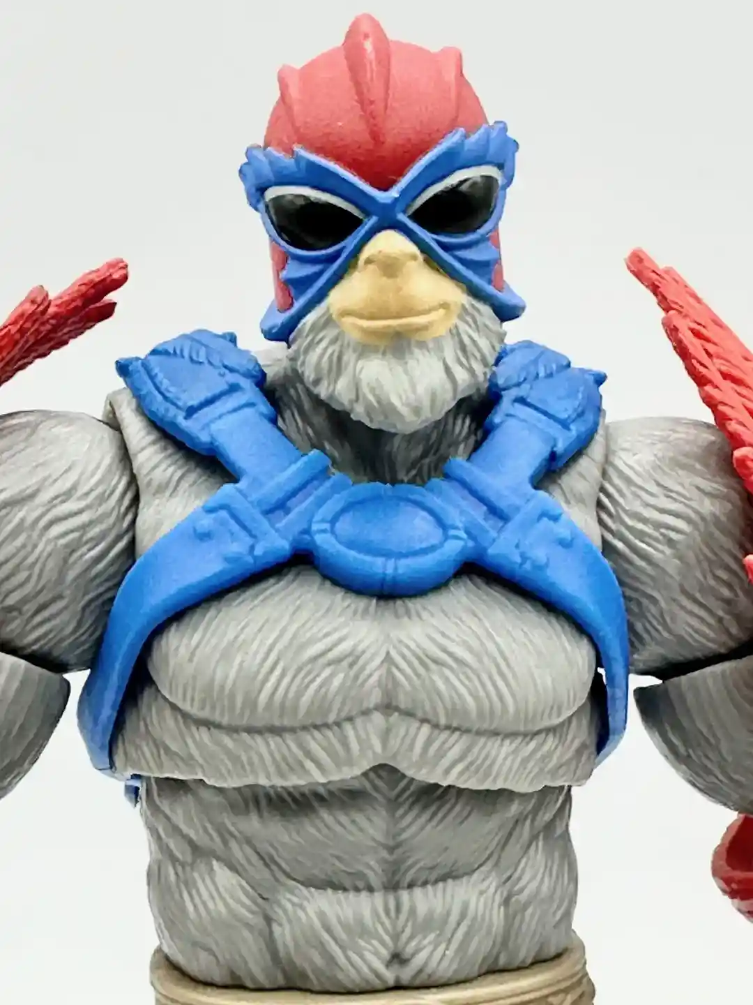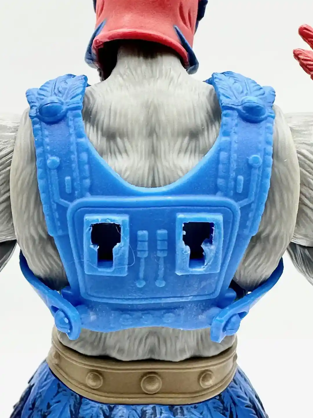 Stratos has a familiar, yet updated head sculpt with his helmet retaining the three crests. One update to the helmet design was the middle crest coming to a point at the back of his skull. The blue outlining his eyes has some flair and it swoops all the way around the side of the helmet. His eyes are given a glossy paint app and pick up the light just right to have a cool reflective look to them. Stratos also has an angular beard design, giving his face some depth and dimension. Because this is a New Eternia figure, you can also see the feathers around his neck, which are removable.