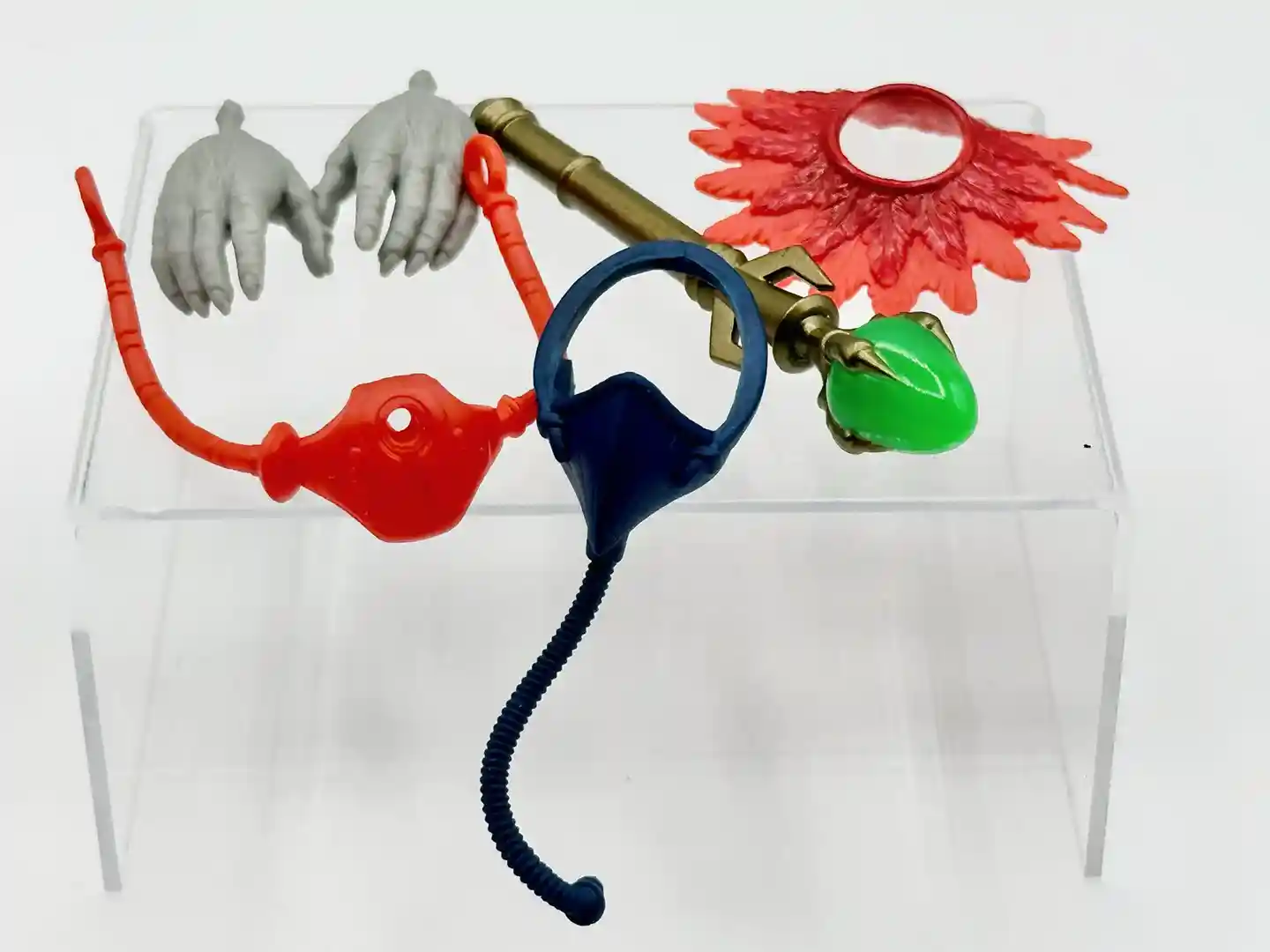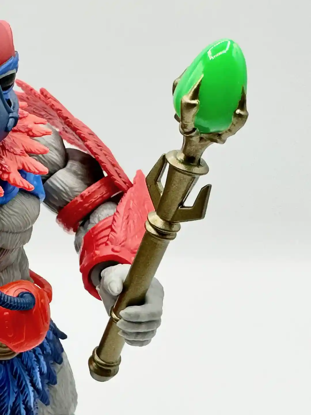 Stratos has an amazing pack out and the best part is that these accessories are removable so you can give him many looks! He comes with a set of extra open hands, his red belt pack, a blue flight mask, feathers that go around his neck (which we saw earlier), and his Emerald Scepter of Avion.