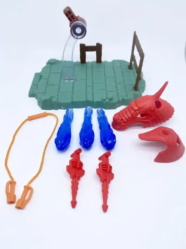 Flight Stand with Green Castle Base: This “flight stand’ for Stridor is spectacular! It allows you to position Stridor in all sorts of amazing action poses! Stridor has a large peg hole in his underbelly to attach the stand too. It is similar to the same flight stand that came with the Wind Raider in articulation. This one comes with a similar green stone base to match your Origins Castle Grayskull and 2 wooden fence pieces to complete the scene. You will also see an indented portion at the end which allows you to tuck it slightly under your castle floor to complete the diorama look.