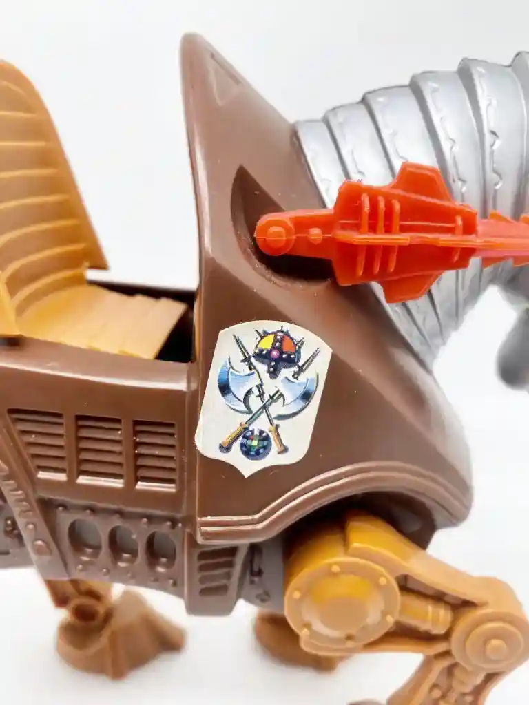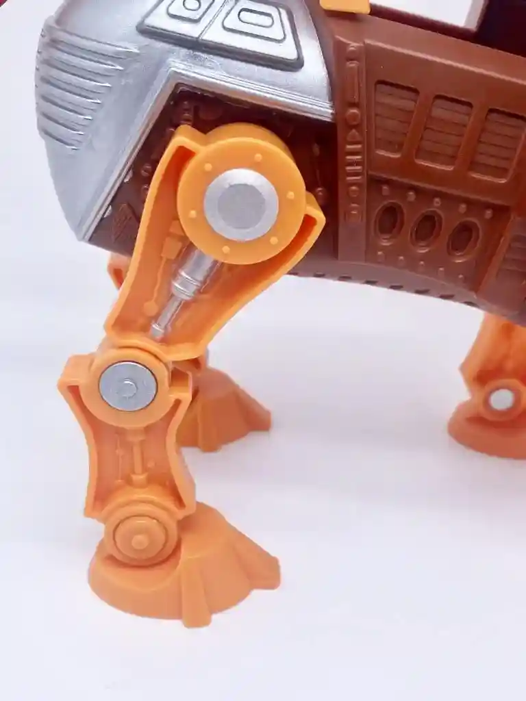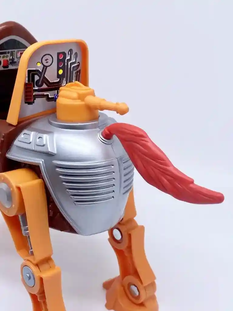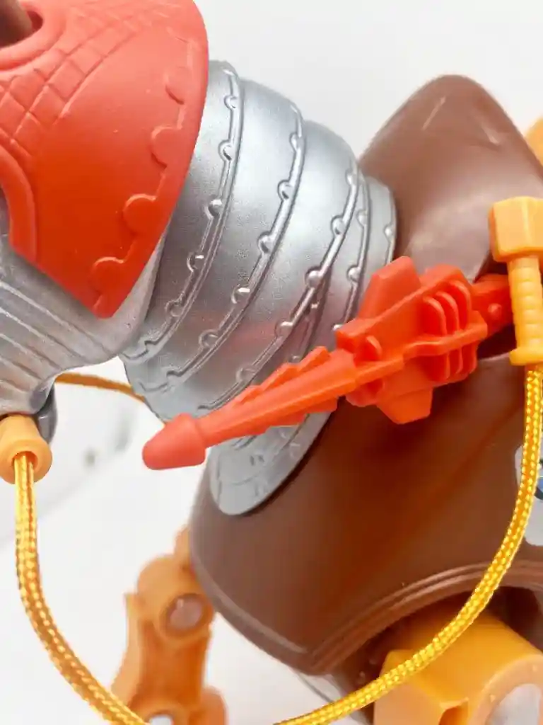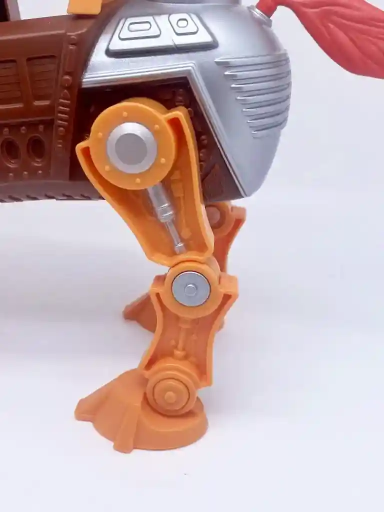 Stridor stands approx. 7″ tall and 10 1/2″ long. He features a staggering 19 points of articulation for extreme poses, unlike his vintage counterpart which was basically a statue. His legs joints, rear laser cannon, front laser cannons, neck, tail and mouth all move! He has a shiny silver head and neck, brown body, orange legs with silver accents, a silver rear end, red articulated tail and an orange swiveling rear laser cannon. He comes packed with a ton of accessories, which we will also take a closer look at below. You can sit your favorite MOTU Origins character in the seat and take Stridor for a ride. In my case, this has always been Fisto’s ride, so he gets the pleasure of riding off into the sunset on Stridor!