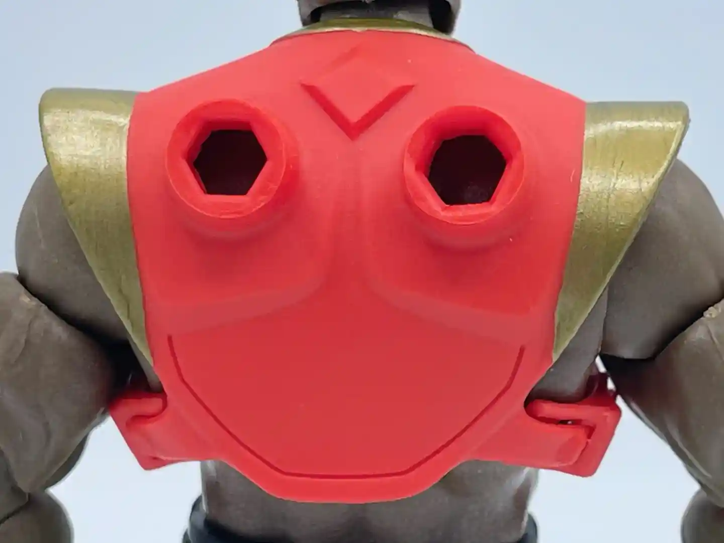 The chest armor features a sun burst design and it actually looks like the energy of the sun is flowing through it. There is definition in the breast plate and also some added sculpted detail on the right and left sides of the ribcage. The gold accents around the shoulders and neck tie in the gold from the sunburst in the middle of the, tying the two together for an amazing look! The back of the armor features a diamond plate in the mid upper back plus two plates that have ports for his wings to plug into.