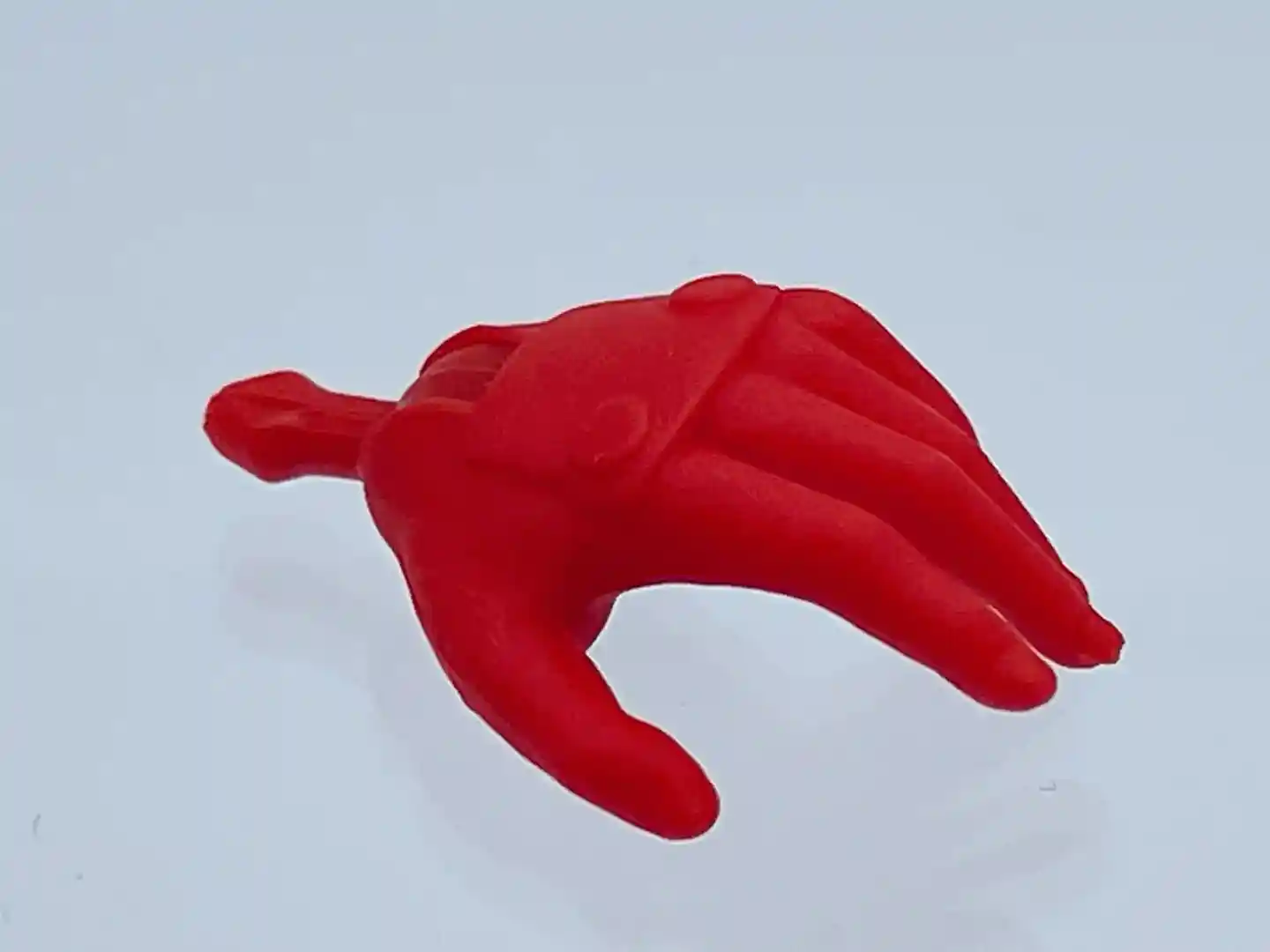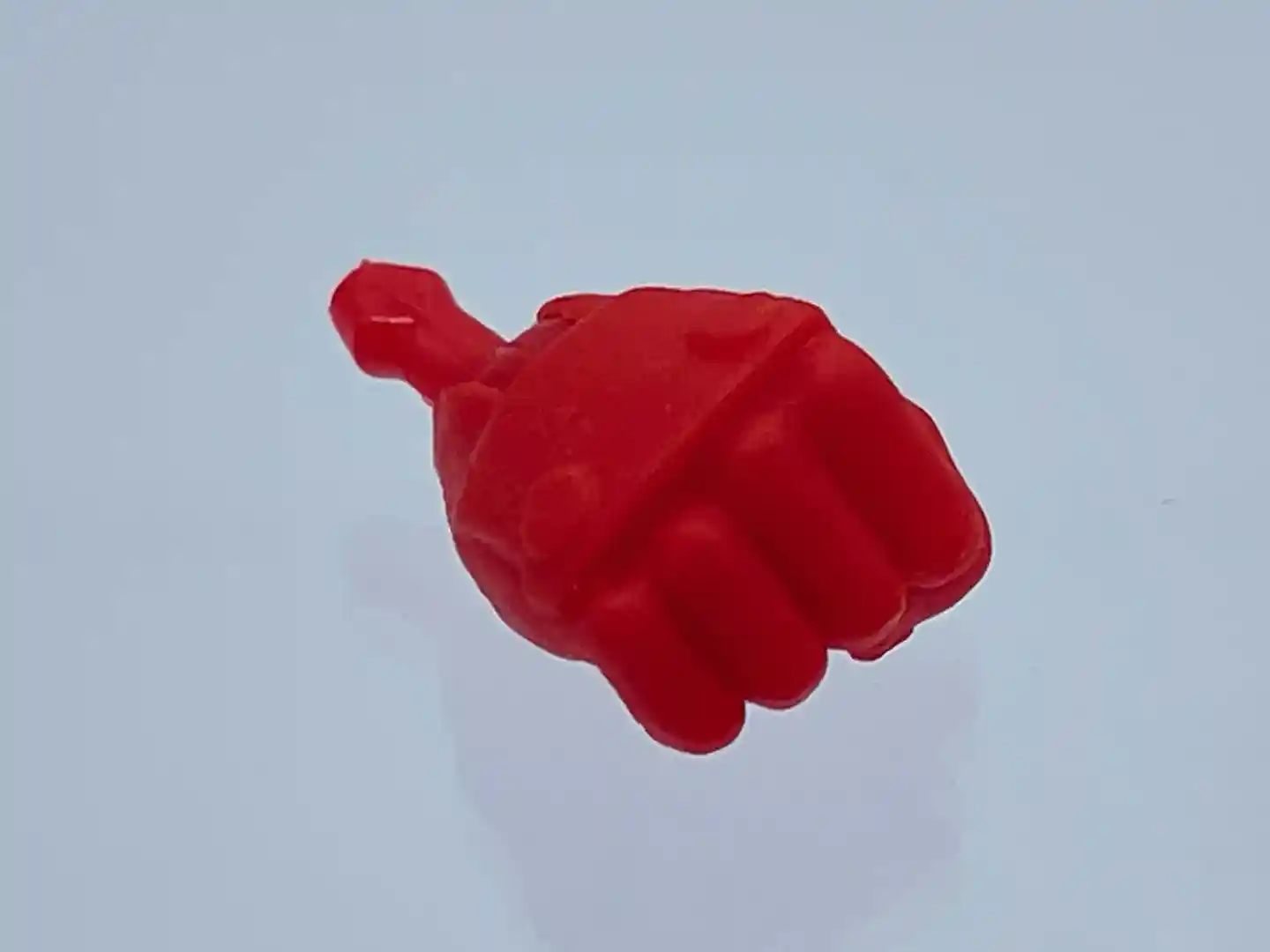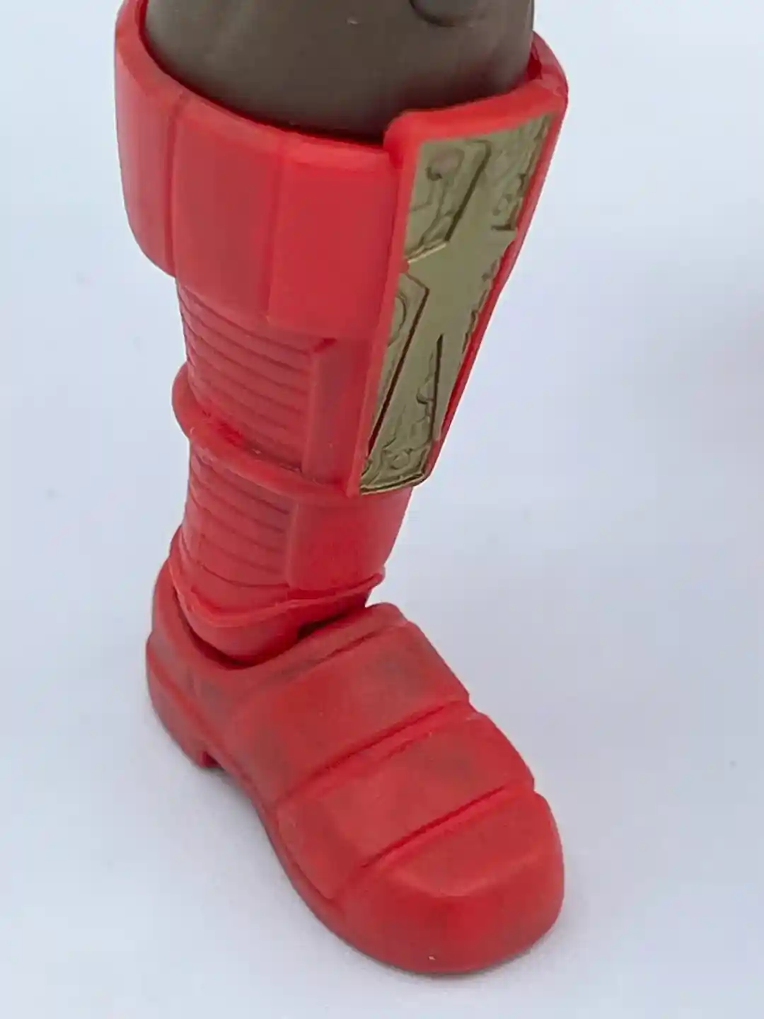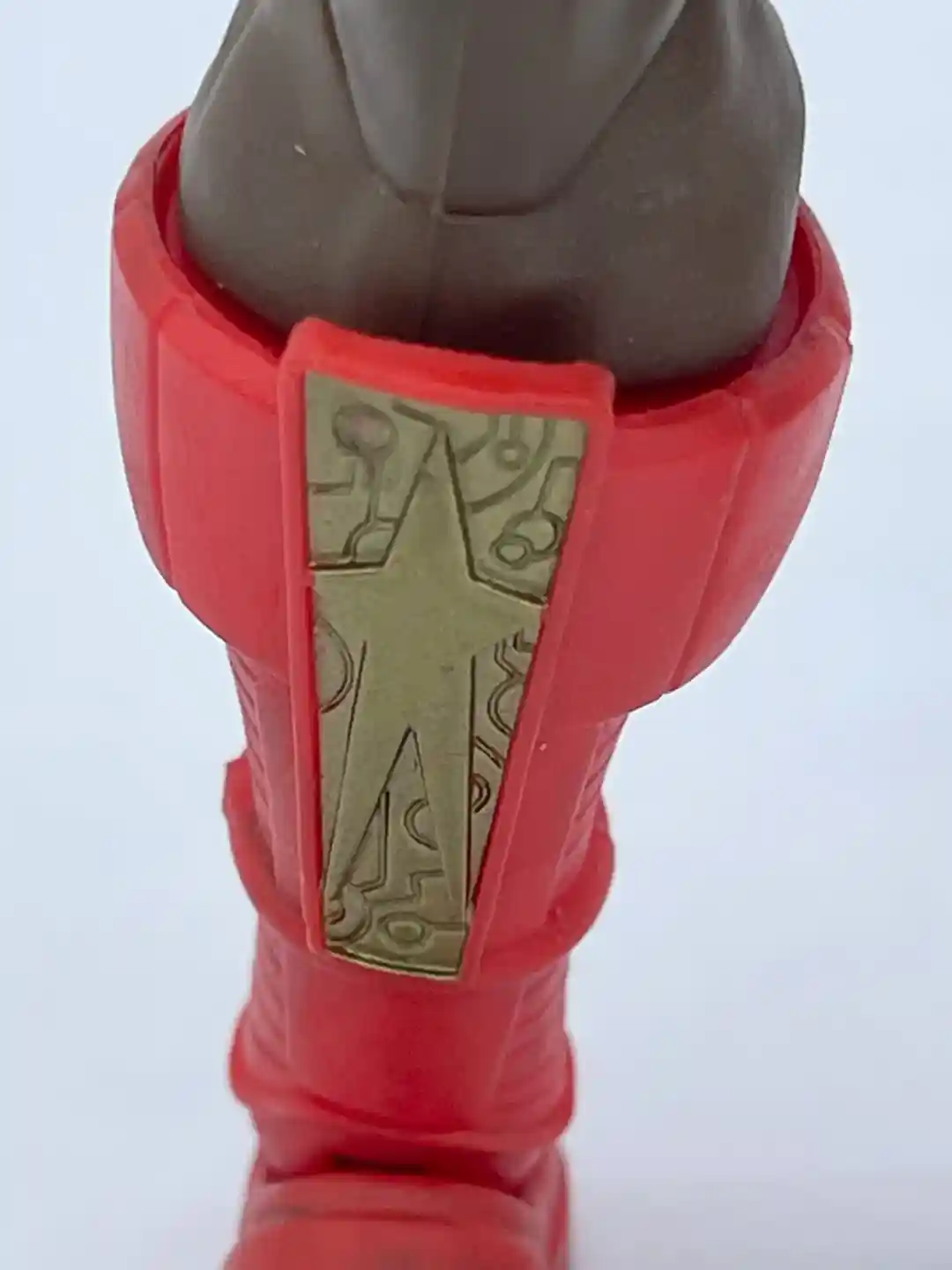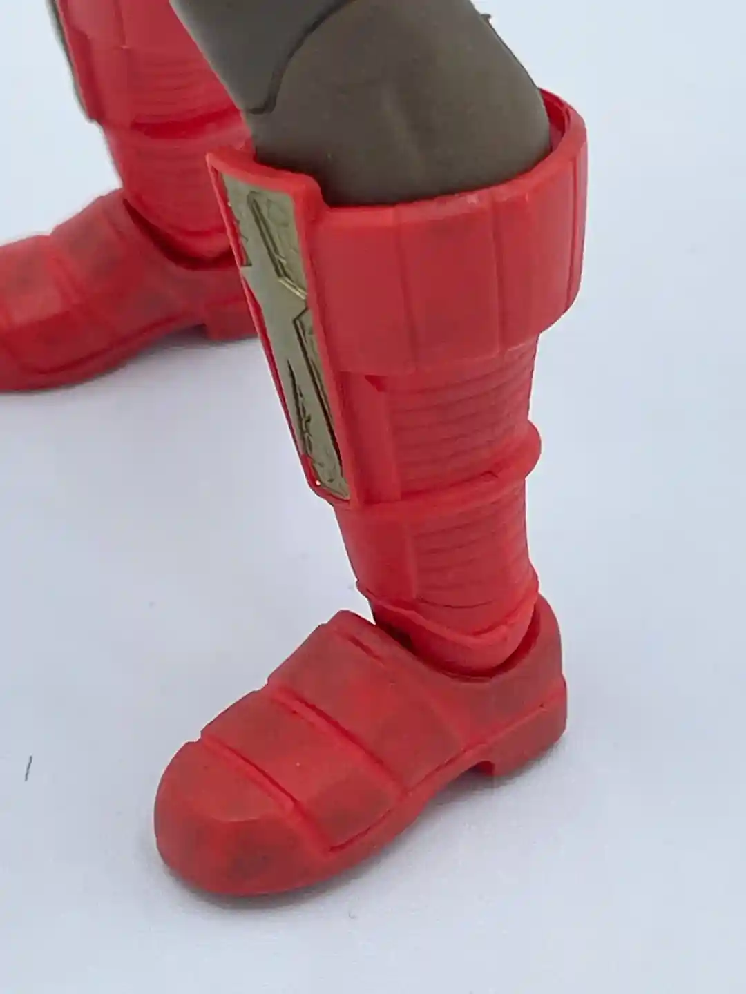 The hands are cast in a red plastic to make them look like gloves. There appears to be a small plate of armor on the tops of the hands to give him protection. Two rivets are sculpted on the armor plates to give them an extra special look.