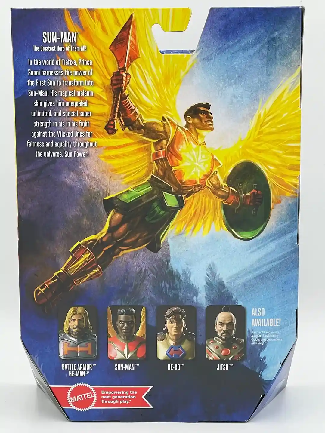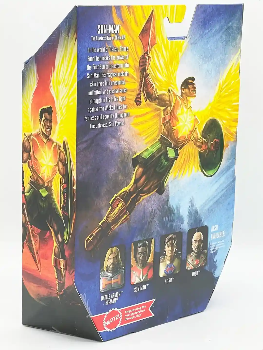 You also see the side art that has an image of Sun-Man with a glorious orange light of sun behind his beautiful yellow wings. The rear box art show Sun-Man flying over Eternia with his wings spread out holding his staff and shield.