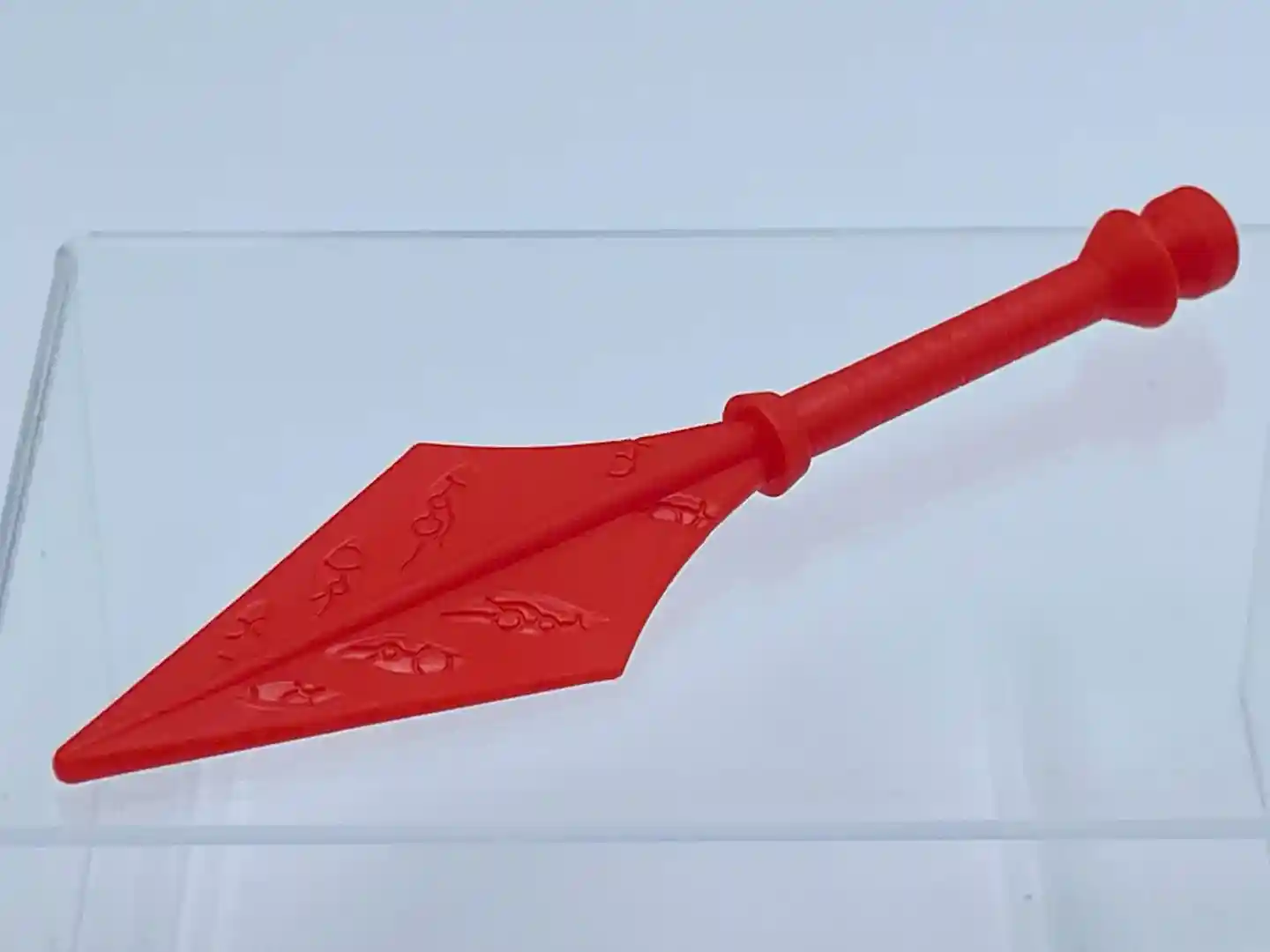 The sword has the traditional shape that is carried over from the vintage figure. It has some extra detail moulded into the blades to give it differentiated look. It has a slightly thicker handle and it the entire piece is cast in a red plastic.