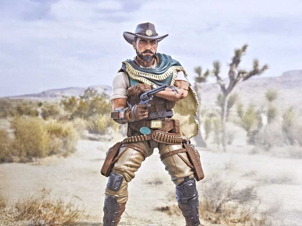 Sundown’s head sculpt shows slicked-back dark hair with and a neatly trimmed beard, along with a tattoo on his neck. The teal poncho drapes naturally over his chest, and the sculpted bullet belt running across his waist is a nice touch.