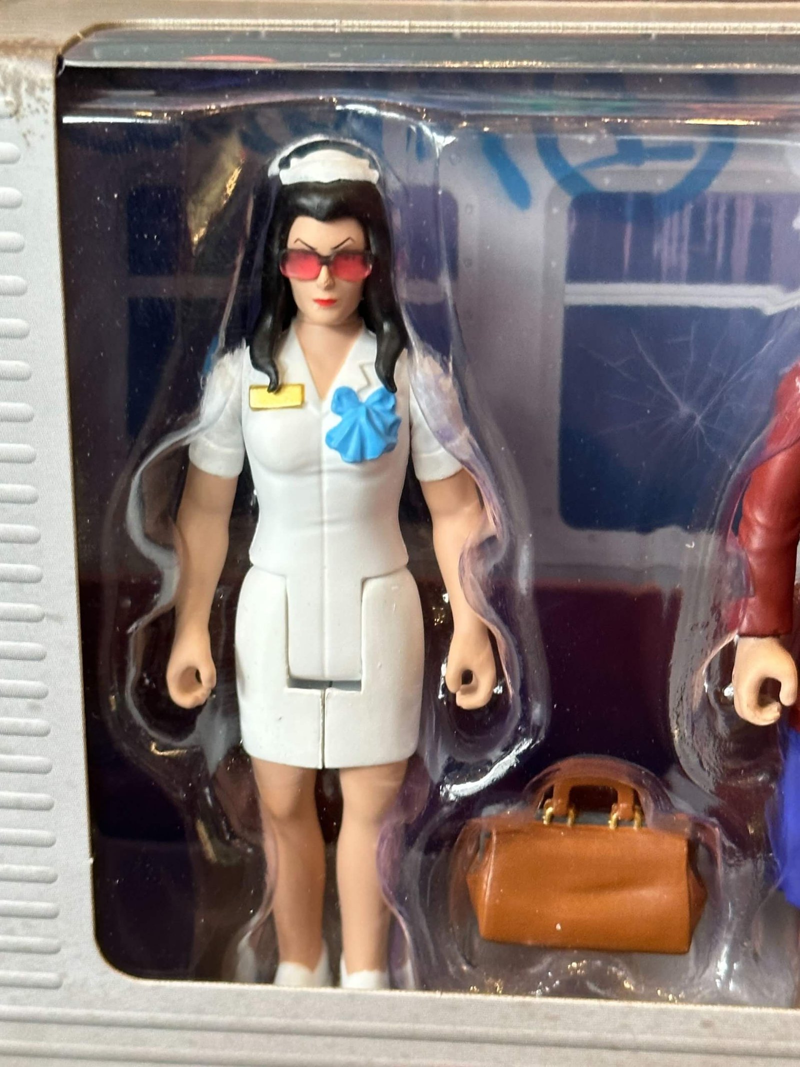 Baroness is dressed as a Nurse with a white Nurse’s outfit, hat and her signature red glasses. She comes with a medical bag. Cobra Commander is dressed as the Old Lady with a wig and wrap on his head, and a frumpy red sweater, purple shirt and blue skirt. He comes with a shopping bag full of food. Destro is dressed as a city construction worker with a whote hard hat, brown shirt and workers gloves, a tool belt and jeans. He comes with a hammer.