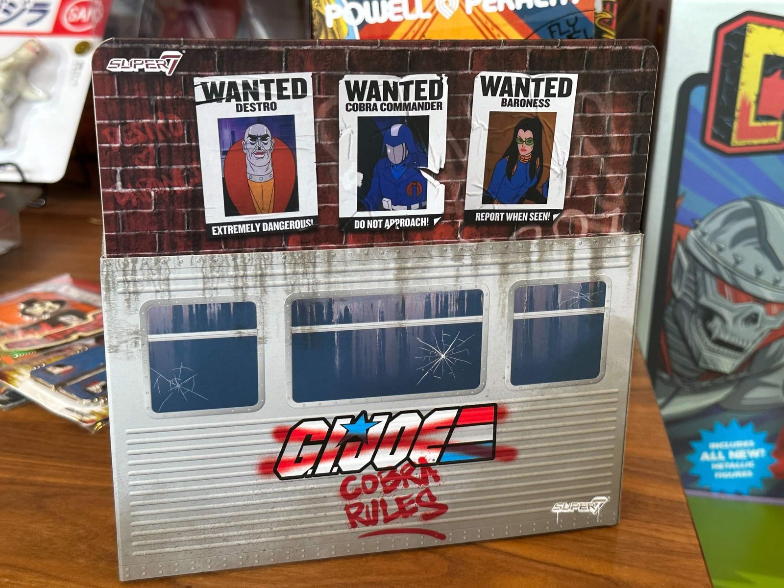 Super7 had posted a teaser image early in the week of a subway car with some graffiti on it reading “Cobra” , “Serpentor 1” and “No Joes”. Well, Super7 does it again, for a truly fun April fool’s day release with their incredibly accurate Sunbow Cartoon series homage to the Cobra Escape scenes from the Pyramid of Darkness, when Destro, Baroness and Cobra Commander escape the Joes in disguises! This follows the previously released SDCC Snakeling Box set from the Pyramid of Darkness as well! Our very own Michael from Toy Habits got a sneak peak at these figures, so we have some exclusive first hand photos of this new box set below!