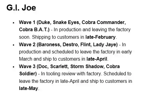 - Wave 1 (Duke, Snake Eyes, Cobra Commander, Cobra B.A.T.) – Production completed and has left the factory. Scheduled to ship to customers late-February 2023.