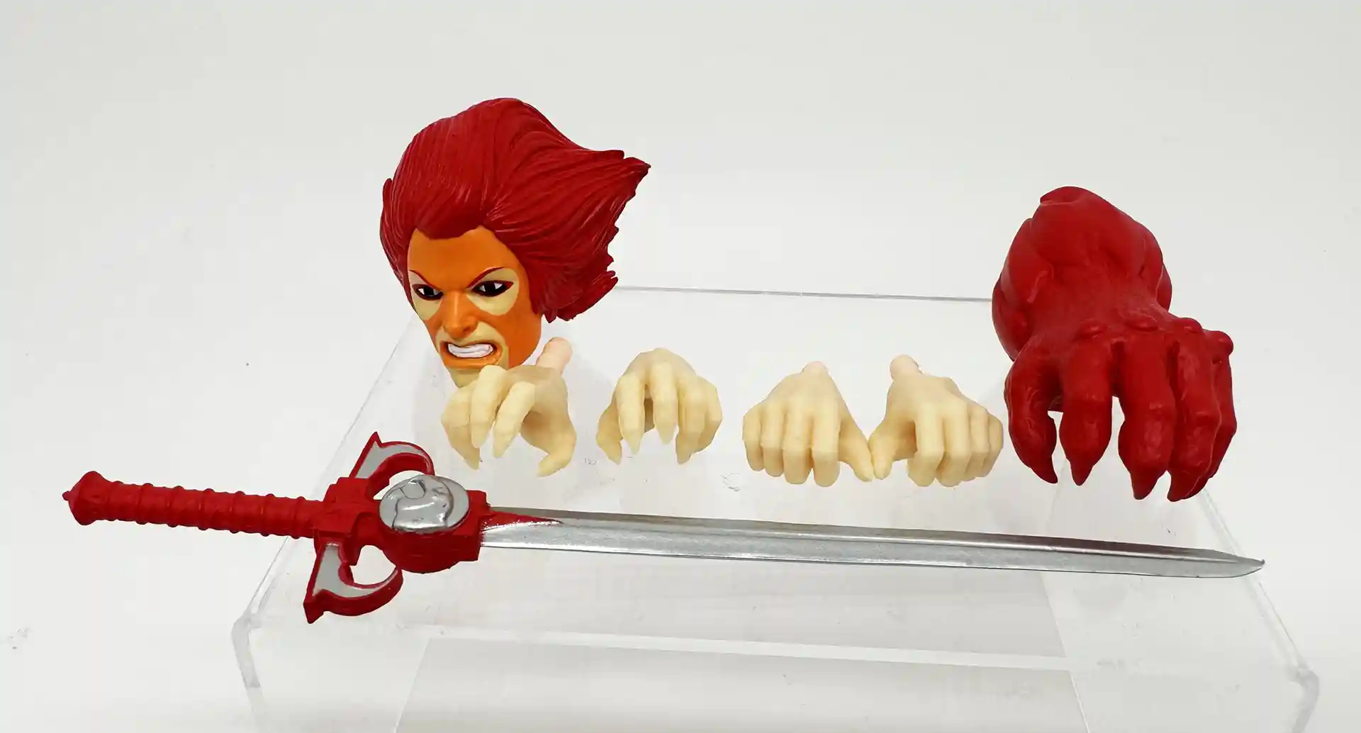 This version of Lion-O came packed with an alternate head, 4 claw shields, an extended sword of Omens, a closed sword of Omens and 2 sets of alternate hands.