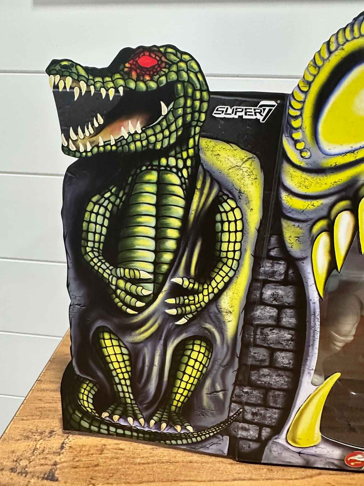 Flanking either side of the Super7 Mumm-Ra’s tomb packaging are two bold, vintage-inspired character illustrations that pay homage to the original 1980s playset. On the left, a sinister green alligator with glowing red eyes and rows of sharp white teeth sits upright with claws resting over a draped gray robe. Its exaggerated scales and curled tail evoke the hand-painted charm of retro design. On the right, a muscular, bull-headed minotaur stands with arms folded, staring menacingly with red eyes and a sly grin. His golden-brown body and flowing gray robe mirror the stylized look of the vintage tomb guardians, completing the nostalgic feel of this retro display.