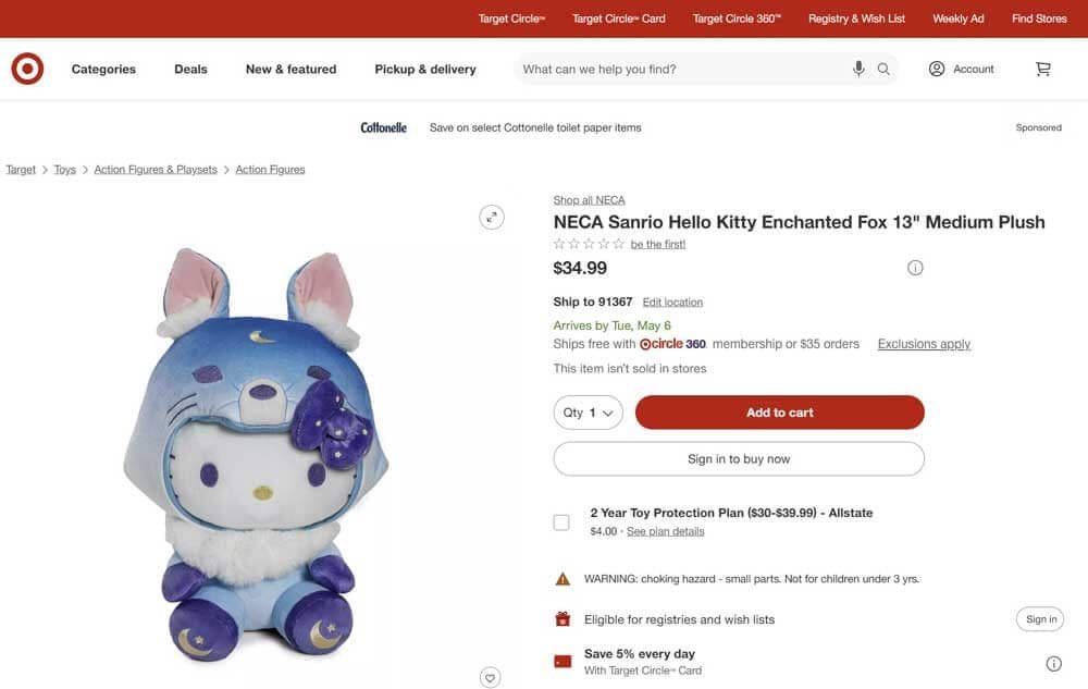 Official Product Description: Join Hello Kitty® in the enchanted forest as she brings some moonlit magic into your life! Dressed up as a little night fox, the supercute icon is ready to make herself at home with you. Her ombre blue outfit includes decadent details like faux fur, embroidery, her signature bow, and a hood to keep her nice and warm! Designed with the softest materials, this Hello Kitty plush collectible by Kidrobot is 13 inches tall and the perfect addition to your Sanrio® collection. Create an enchanted animal sanctuary when you pair her with the Hello Kitty Enchanted Deer Plush and the Hello Kitty Enchanted Rabbit Plush!