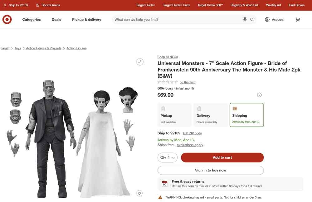 Product Description: We belong dead… Celebrate over 90 years of horror and doomed romance with this haunting tribute to the classic Universal Monsters film, The Bride of Frankenstein! NECA proudly presents a commemorative action figure 2-pack that brings Frankenstein’s Monster and his Bride together in one electrifying collector’s set. When the Monster meets his true love and finds that his feelings are unrequited, he flips the switch that implodes the castle—ending their tragic love story before it even begins. Featuring black and white deco, looking as if they just stepped off the silver screen, these 7-inch scale figures include multiple interchangeable heads and hands, and a soft goods robe for the Bride. Bring home this infamous couple, together at last in limited-edition window box packaging with slipcover.