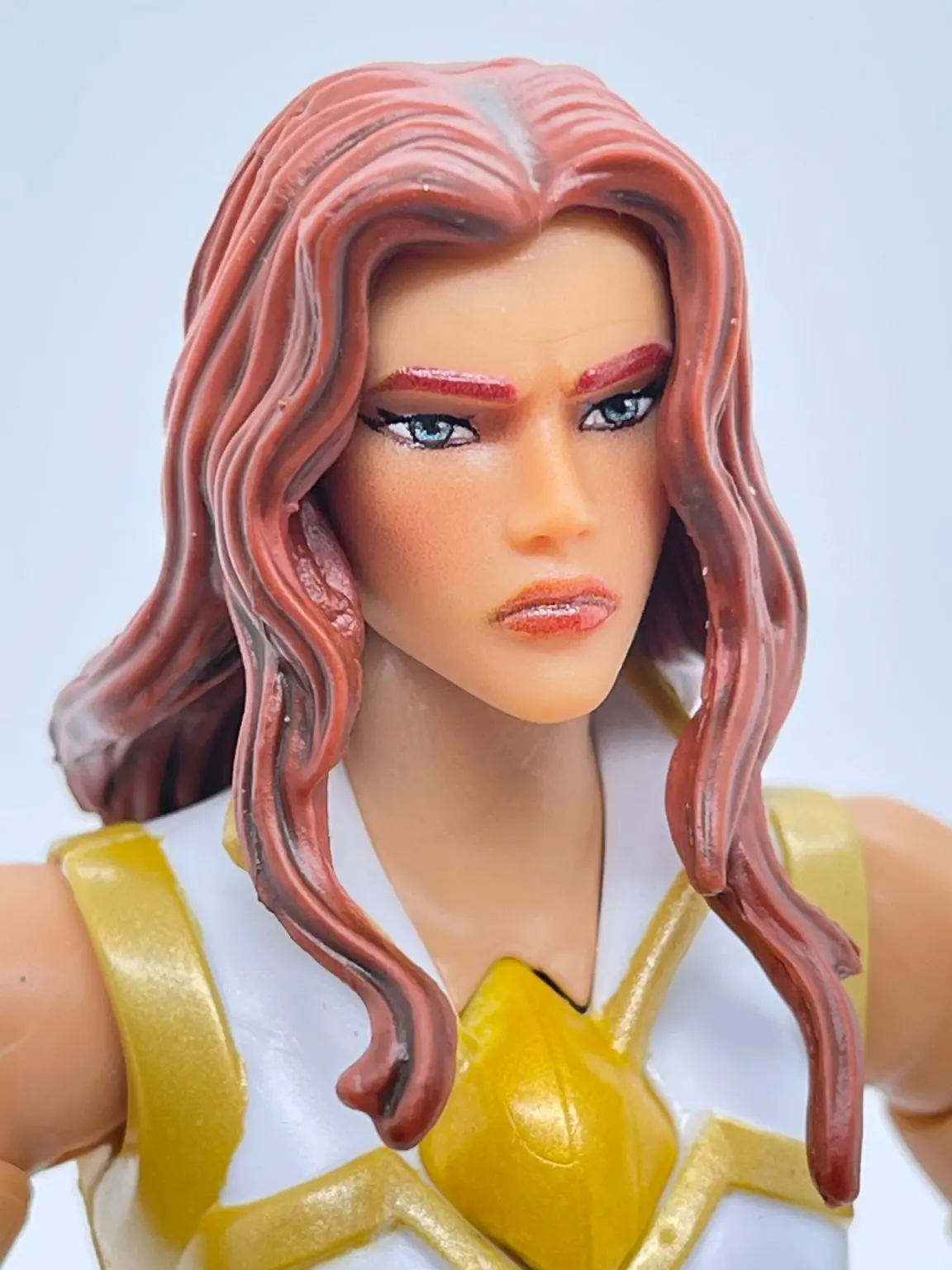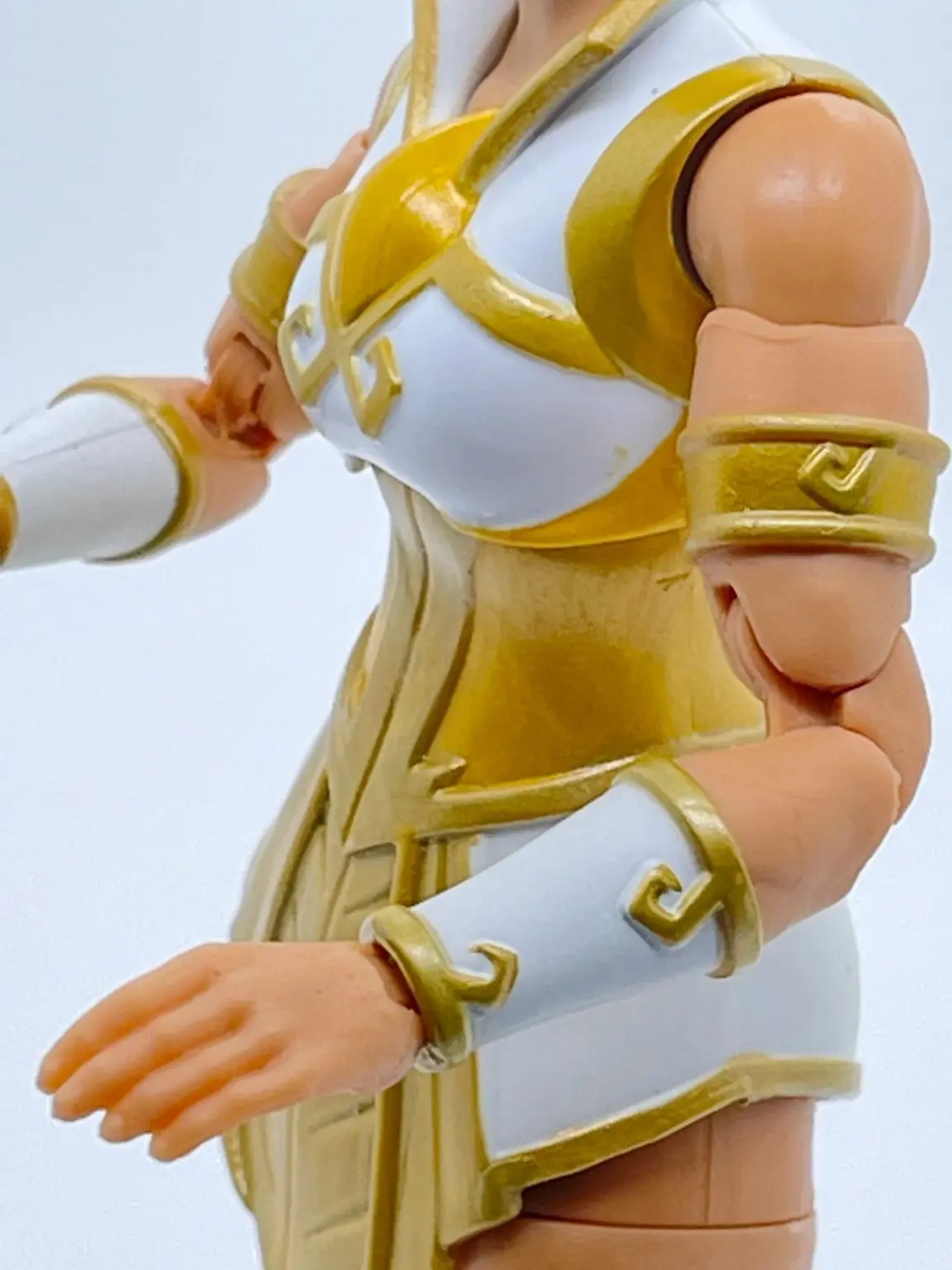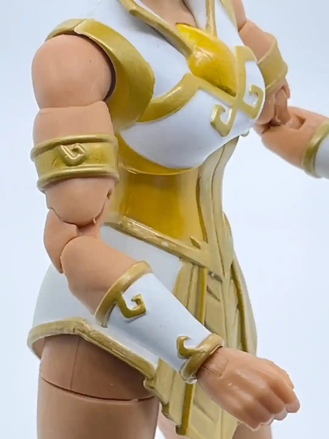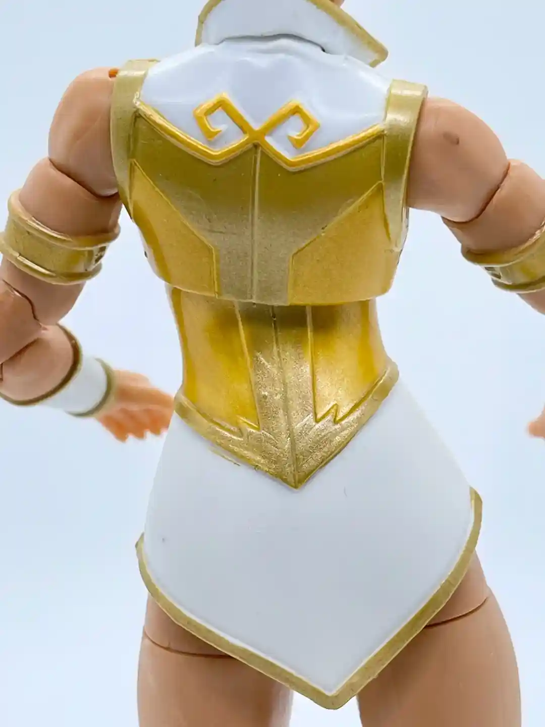 Her arms seem to be an all new sculpt as well. They did a good job at balancing the shape and the muscle tone of her arms to nicely represent the Revelation Cartoon version of Teela. That was one criticism many people had on the first version of Teela, was that she looks too jacked up, so this is a nice balance. Her left and right arms are symmetrical, and they both have gold colored bicep bracers and white with gold colored wrist bracers as well.