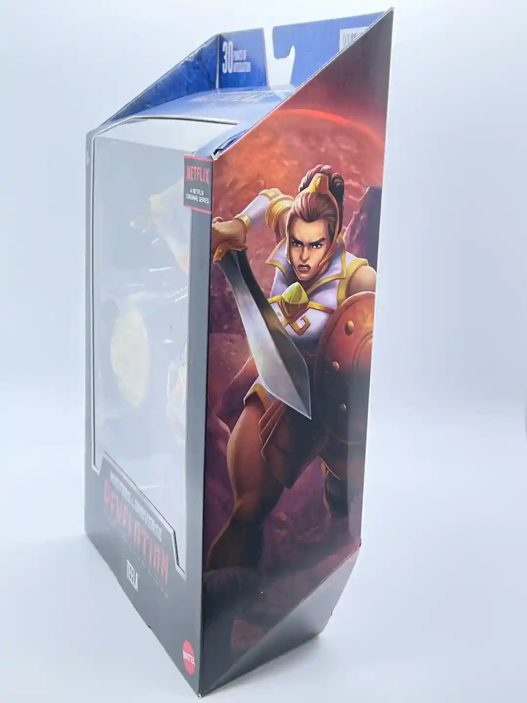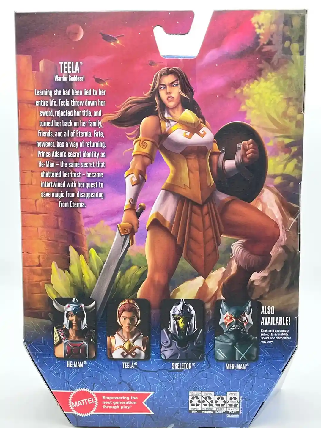 Teela comes packaged in the typical Masterverse collector friendly window box. The side box art shows a classic image of Teela wearing her crown, ready to attack. The rear box art on Teela is simply stunning, with a beautifully illustrated image of Teela with her long hair flowing wheedling her sword and shield, standing near what looks to be a castle turret, with the beautiful reddish purple Eternian sky in the background.