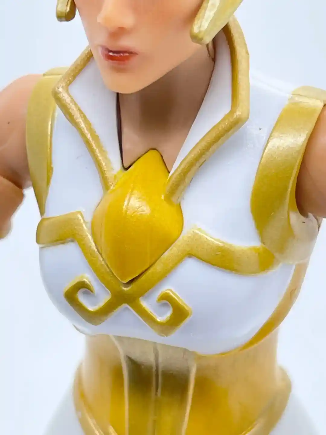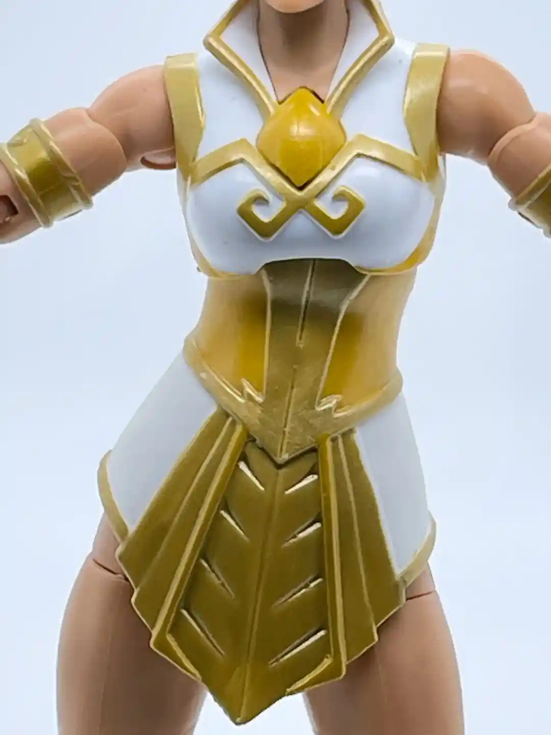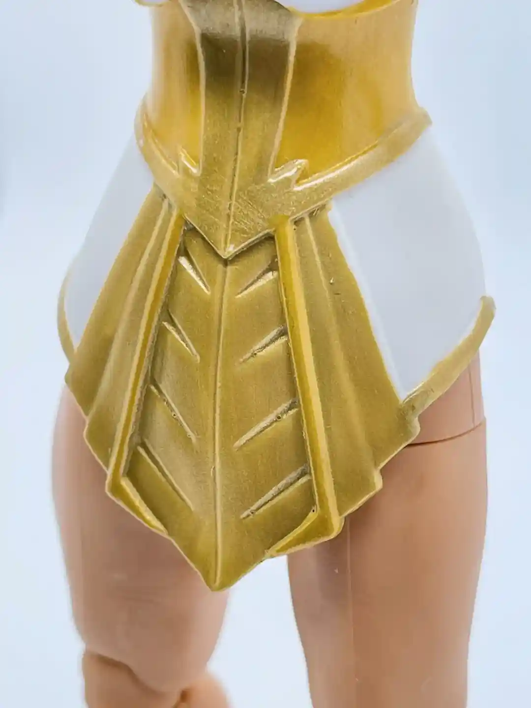 Teela’s torso and waist looks to be a brand new sculpt. Her outfit is representing the classic leader of the palace guard, Filmation style we are all used to see Teela wearing. It is a white dress, with yellow and gold trim and accents. Her collar has that typical Teela upswing, with gold trim, and then the sleeveless dress has gold accents with a yellow and gold design at the waist and back, which do a nice job at hiding the ab crunch articulation line. The skirt has a nice gold armor piece on the front as well.