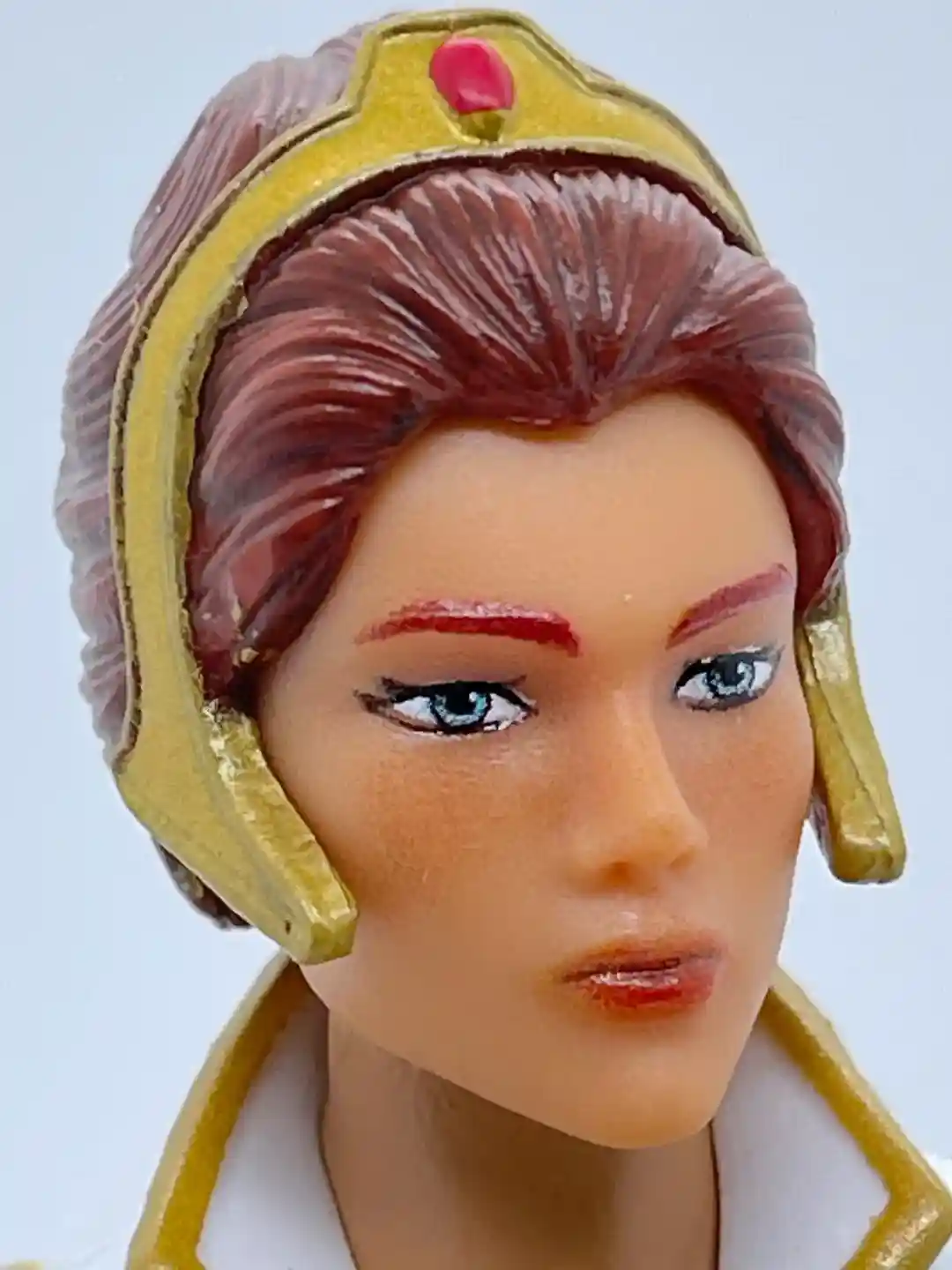 This Wave 4 version of Teela captures that classic look everything knows and loves. Teela comes packed with both the classic looking head sculpt and an alternate head with free-flowing hair. Her classic head sculpt is especially well done. Her head resembles that classic Teela look, with her reddish-brown hair in a bun, and tiara with a red jewel, in the Revelation cartoon style. Her face features rosy cheeks, red lipstick and very nicely detailed eyes with beautifully painted reddish-brown eyebrows.