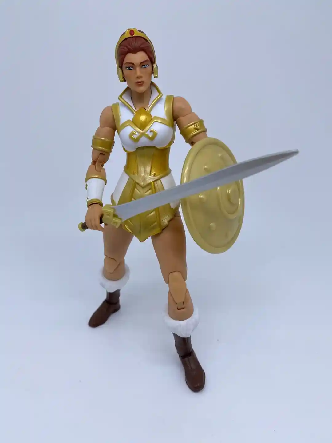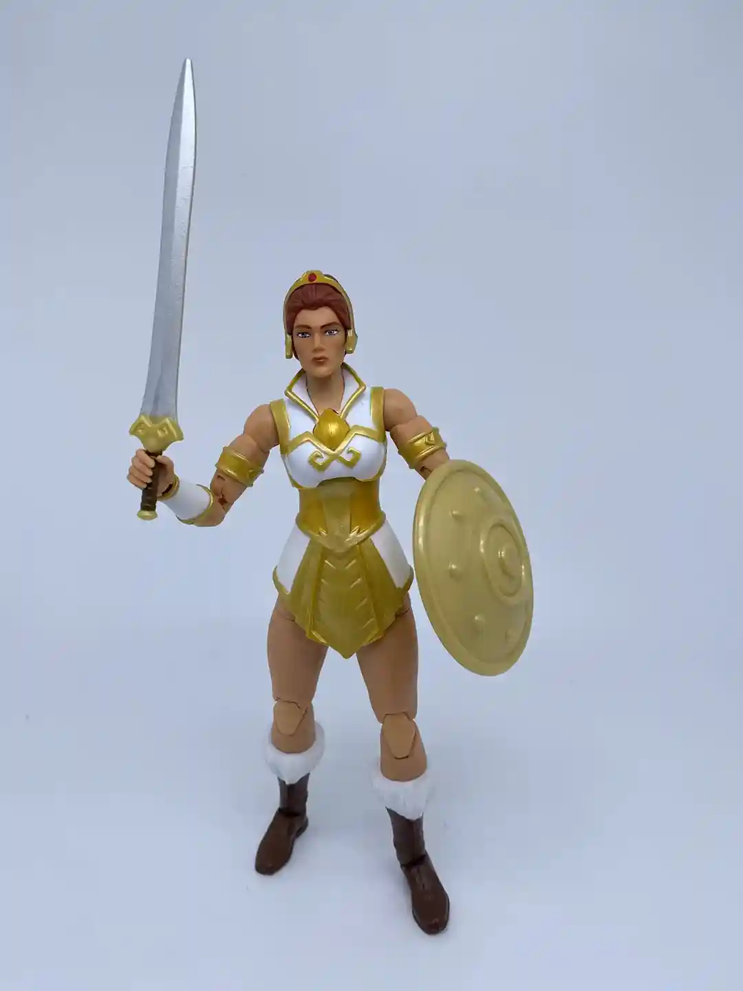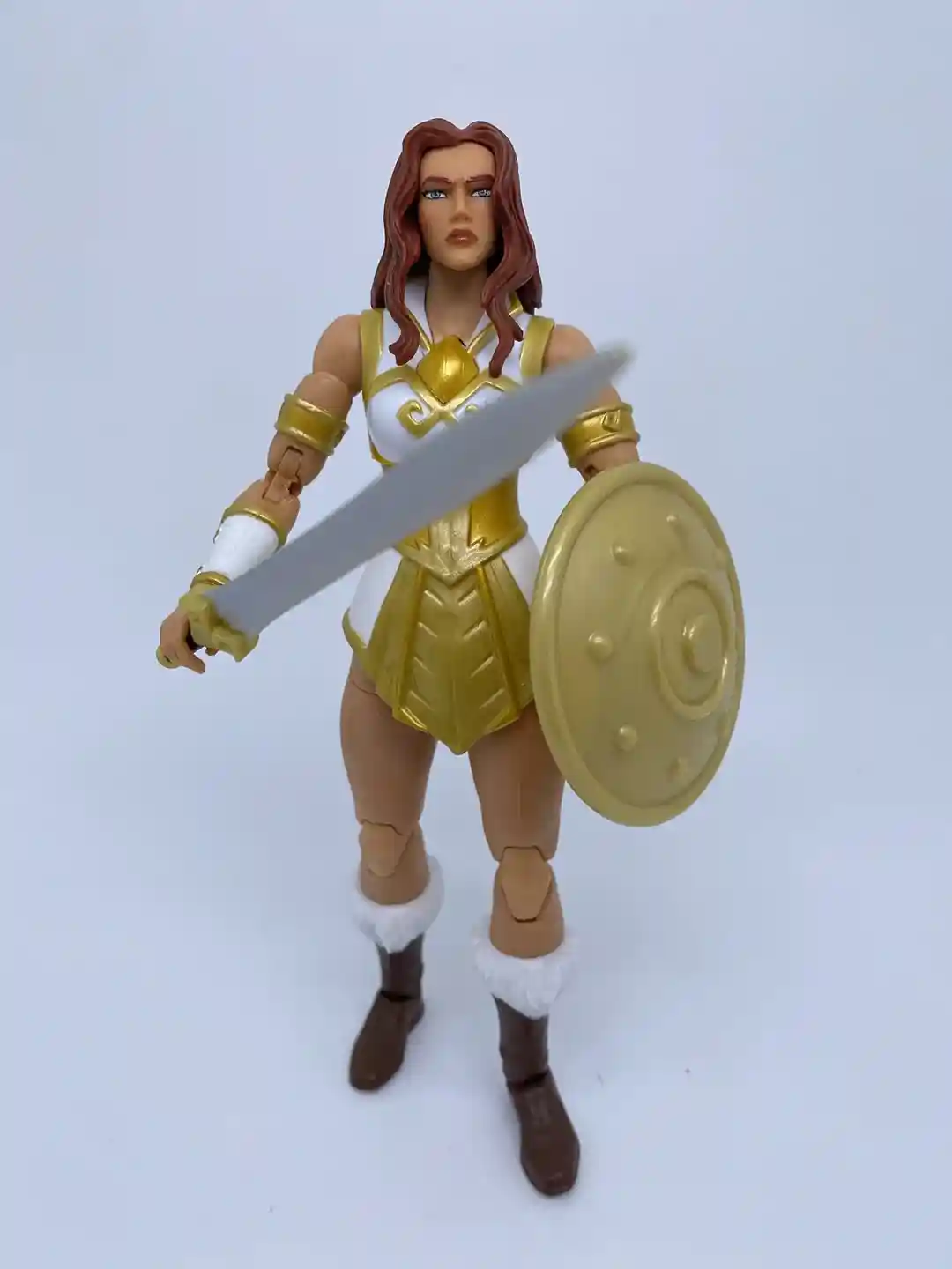 Teela comes with an all-new sword design. The sword resembles the sword that Teela wheedled in the Netflix Revelation cartoon. With a long silver blade, brown & gold colored hilt, and gold simple cross guard, this beautiful sword fits this version of Teela perfectly! It truly is a classic sword, for a classic version of Teela!