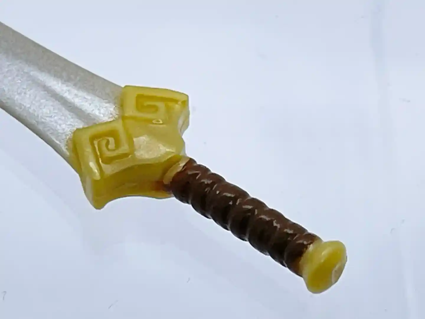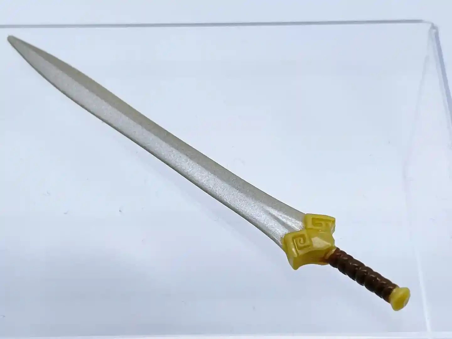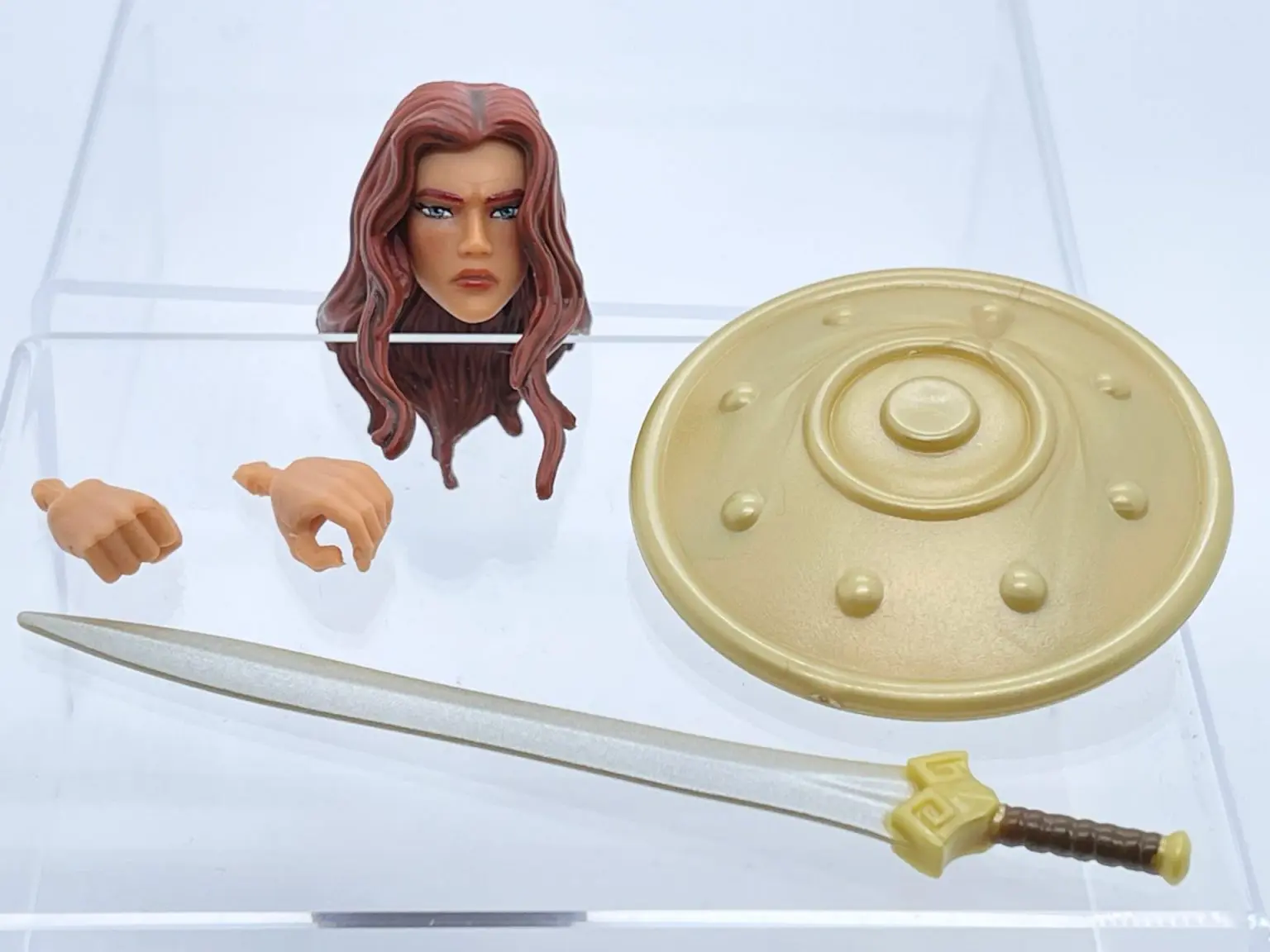 Teela comes with an all-new sword design. The sword resembles the sword that Teela wheedled in the Netflix Revelation cartoon. With a long silver blade, brown & gold colored hilt, and gold simple cross guard, this beautiful sword fits this version of Teela perfectly! It truly is a classic sword, for a classic version of Teela!