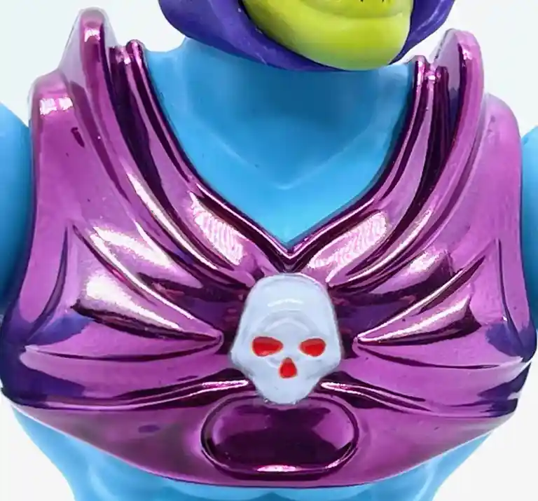 The money shot is Terror Claws Skeletor’s vac metal chest armor (or crop top…whatever you want to call it). It is shiny but not as reflective as Flying Fists He-Man’s but, overall, it looks amazing and well done! The white skull with red eyes and nose in the middle really stands out! The chest armor design also mimics his battle armor shape, but the detail blends with the vac metal treatment.