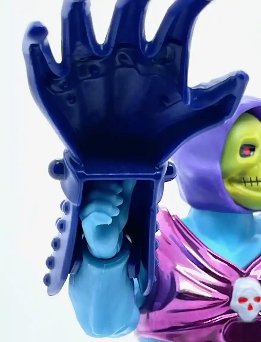 Terror Claws Skeletor comes packed with a closed mouth head sculpt resembling his vintage figure look with black eye sockets and red beady eyes! His hood is a light purple than we’ve seen on previous versions of Skeletor and the difference is really apparent in the head sculpt comparison in the Weapons and Accessories section.