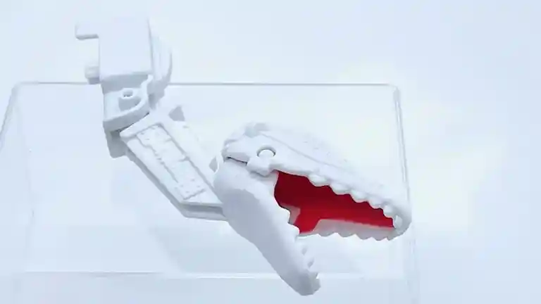 Next up let’s take a look at his dragon weapon, which is white except for a painted red mouth. It has some very cool technical detail sculpted on the shaft and on the eyes. It makes a really cool clickty clacking sound when you place it in his hand and he is flailing about. The cool thing is that the Dragon stows nicely in the plastic clip on the back of Skelly’s armor!